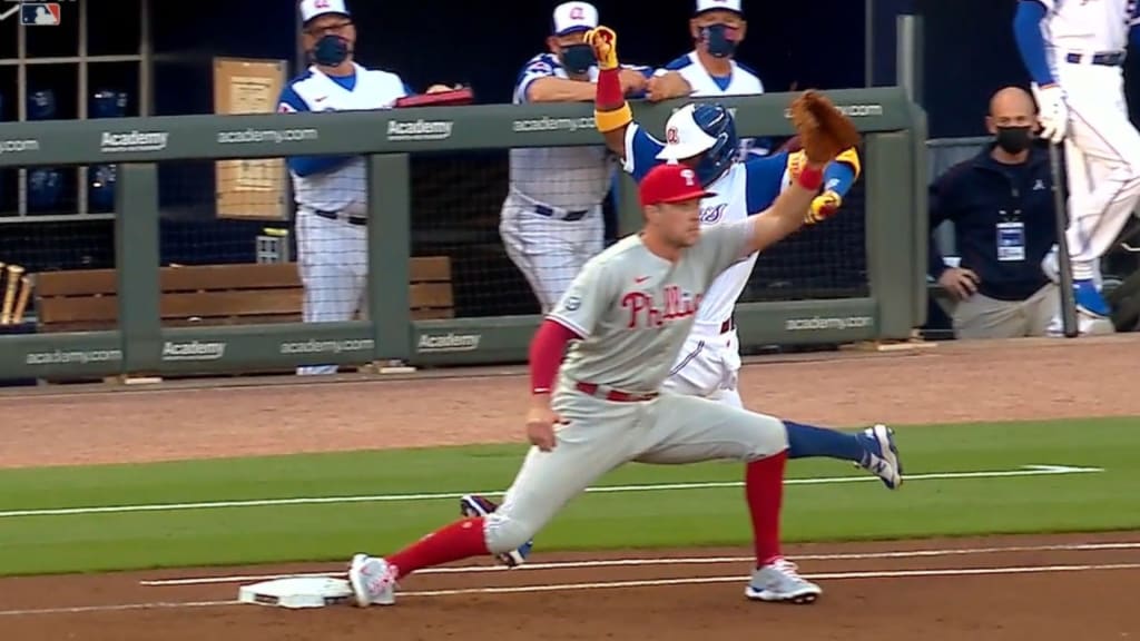 Acuña conectó un roletazo ante el primer pitcheo que vio de Matt Moore hacia el campocorto de los Filis Didi Gregorius y llegó quieto luego de alcanzar 31 pies por segundo para vencer el tiro.