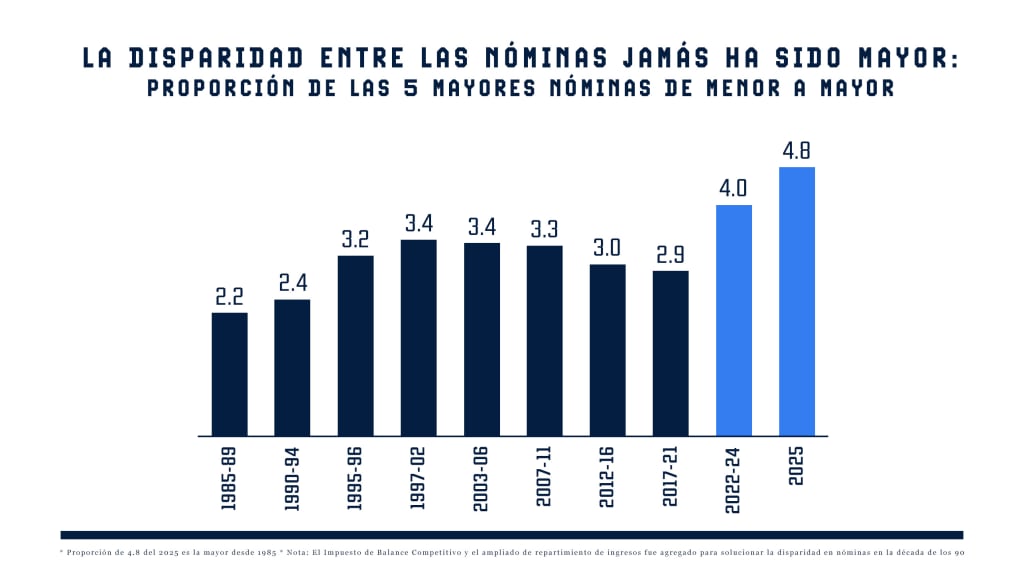Pero incluso en la época del impuesto del balance competitivo, que se implementó para reducir esas brechas, la disparidad entre nóminas se sigue ampliando.