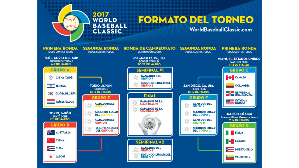 La primera ronda se disputará en formato todos contra todos y los dos primeros avanzarán a la segunda fase de grupos. La final será el 22 de marzo en el Dodger Stadium de Los Ángeles.
