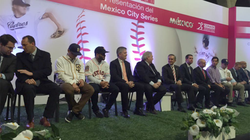 La "Mexico City Series" fue presentada la mañana de este miércoles en el Palacio de Gobierno de la Ciudad de México teniendo como invitados especiales a Dominik Balsamo, vicepresidente internacional de las Grandes Ligas; a los peloteros José Altuve (Astros) y Luis Urías y Austin Hedges (Padres); y a los gerentes generales Jeff Luhnow (Astros) y A.J. Preller (Padres).