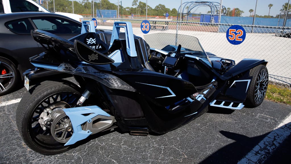 Céspedes ha conducido seis vehículos distintos en seis días desde su residencia en Vero Beach al complejo de entrenamientos. El desfile incluyó un Avorza Polaris Slingshot de color negro y azul el sábado.