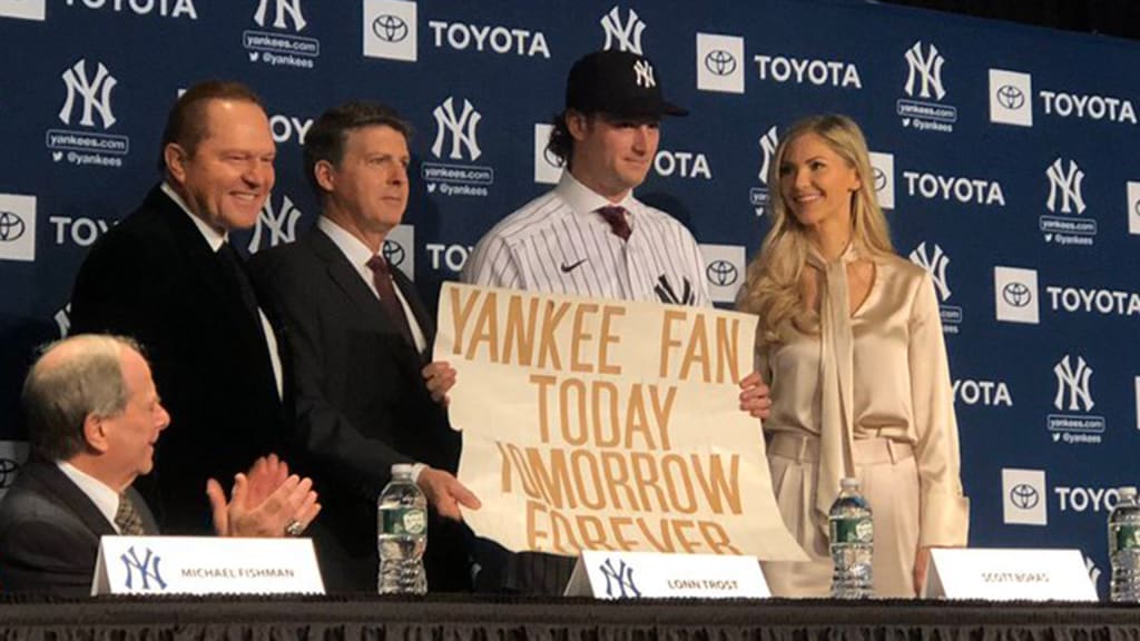 NUEVA YORK -- Gerrit Cole llegó al Yankee Stadium el miércoles para su presentación como nuevo integrante de los Yankees de Nueva York con un cartel arrugado que decía "Aficionado de los Yankees hoy, mañana y siempre".