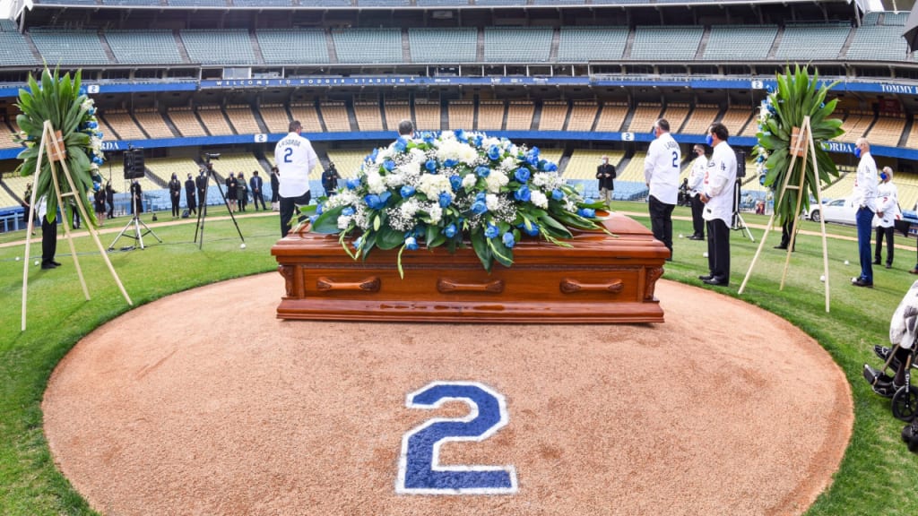 Su féretro, cubierto con diversas flores blancas y azules, fue colocado en el montículo del pitcher. En la parte posterior de la lomita se pintó en azul un número 2, el que usaba Lasorda en el jersey.