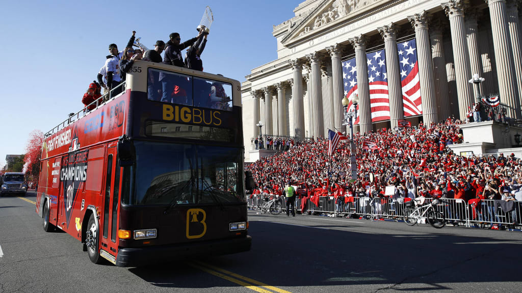 Con un puro en la boca, el gerente general Mike Rizzo emergió de uno de los autobuses para mostrar el trofeo de campeones. Intercambió palmadas con algunos fanáticos que estaban detrás de las vallas.