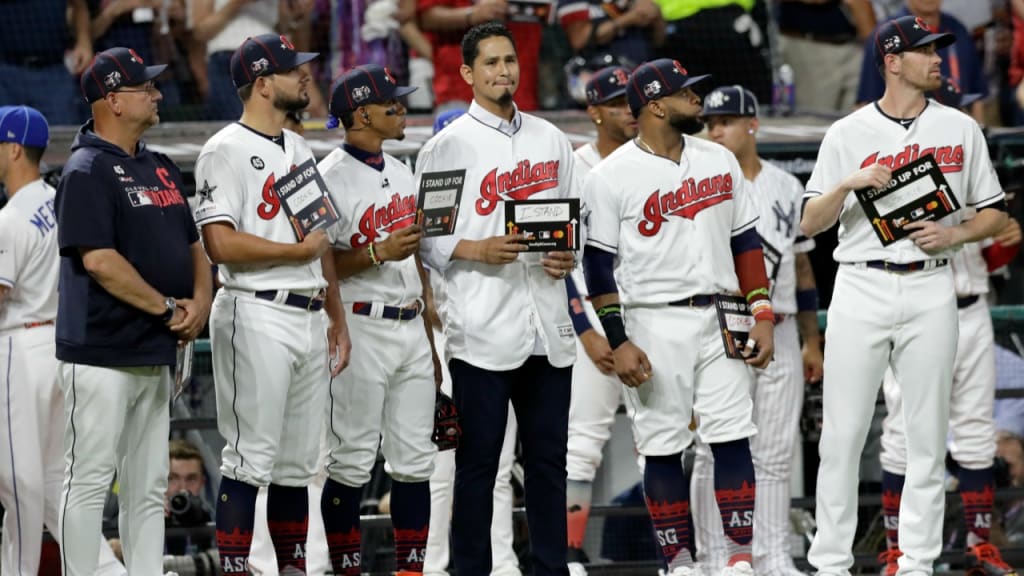 Carrasco se paró en la zona del coach de la antesala, flanqueado por cuatro peloteros de los Indios y por el manager Terry Francona. El pitcher venezolano de 32 años sostuvo un cartel que decía: “Me pongo de pie por...”. A su lado, su compañero boricua Francisco Lindor mostró otro letrero que mencionaba “Cookie”, el apodo de Carrasco.