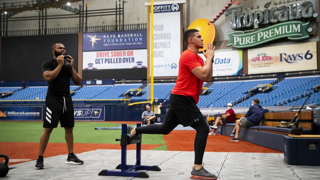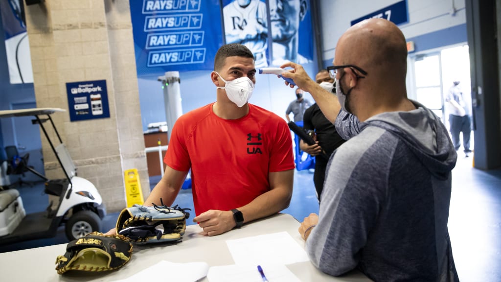 Antes de ingresar al Tropicana el lunes, el preparador físico del equipo, Joe Benge, les hizo algunas preguntas a los jugadores y coaches para conocer un poco lo que éstos hicieron durante la contingencia por la pandemia del coronavirus. También se les tomó la temperatura y se les pidió que pasaran por estaciones de sanidad dentro del estadio.