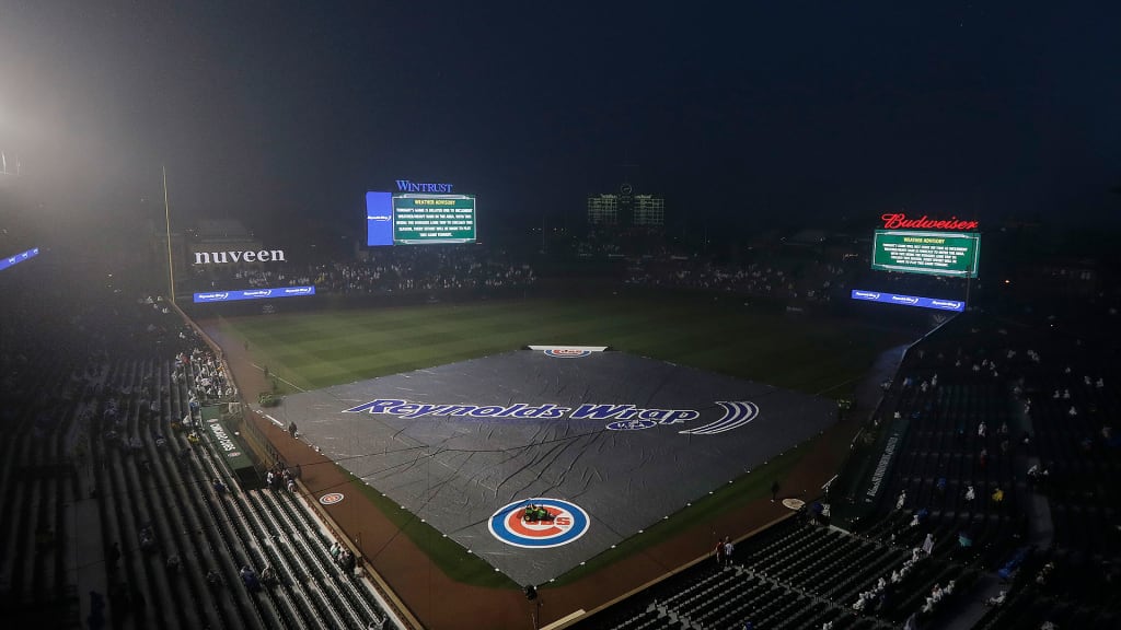 Fue un día soleado y caliente en Chicago la mayor parte del lunes, pero las nubes empezaron a rodear el área unas dos horas antes del primer lanzamiento. Un aguacero inicial se detuvo en un momento dado y la cuadrilla del campo retiró la lona que lo cubría, solo para tener que volver a colocarla después de un breve periodo.