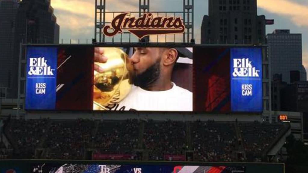 El lunes en el Progressive Field de Cleveland, los Indios recibieron a los Rays y le rindieron homenaje a James y los Cavaliers con la Kiss Cam (la cámara que capta a las parejas dándose un beso). En esta ocasión, no se trató de una pareja, sino una imagen de James dándole un beso al trofeo de campeón de la NBA.