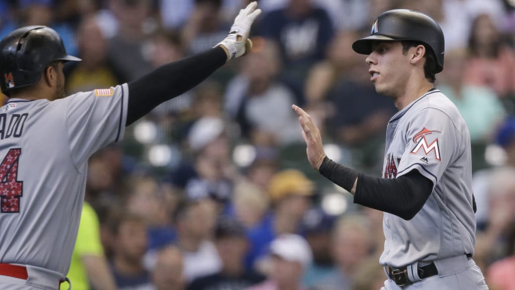 MILWAUKEE - El dominicano Domingo Santana bateó un cuadrangular de dos carreras que rebotó en el guante de Giancarlo Stanton para dar inicio a una ofensiva de siete anotaciones en la segunda entrada y guiar a los Cerveceros de Milwaukee a un triunfo el sábado 8-4 sobre los Marlins de Miami.