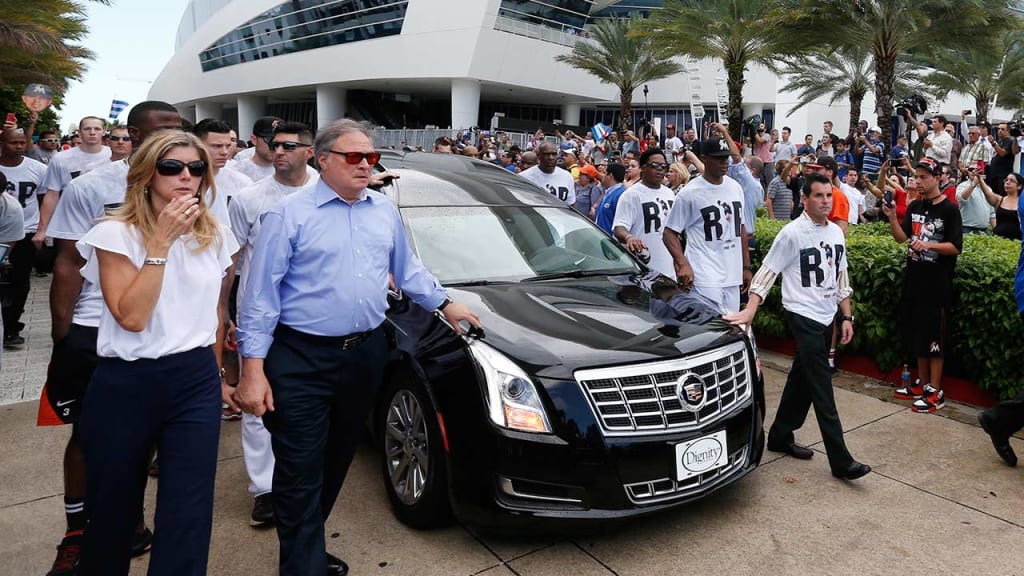 El dueño de los Marlins, Jeffrey Loria, el manager Don Mattingly, el coach de bateo Barry Bonds y los jugadores del equipo, incluyendo su estrella Giancarlo Stanton, vistieron camisetas blancas con la imagen de Fernández y las letras "RIP" (Descansa en Paz) mientras caminaban lentamente alrededor de la carroza que salía del Marlins Park en el barrio Pequeña Habana de Miami.