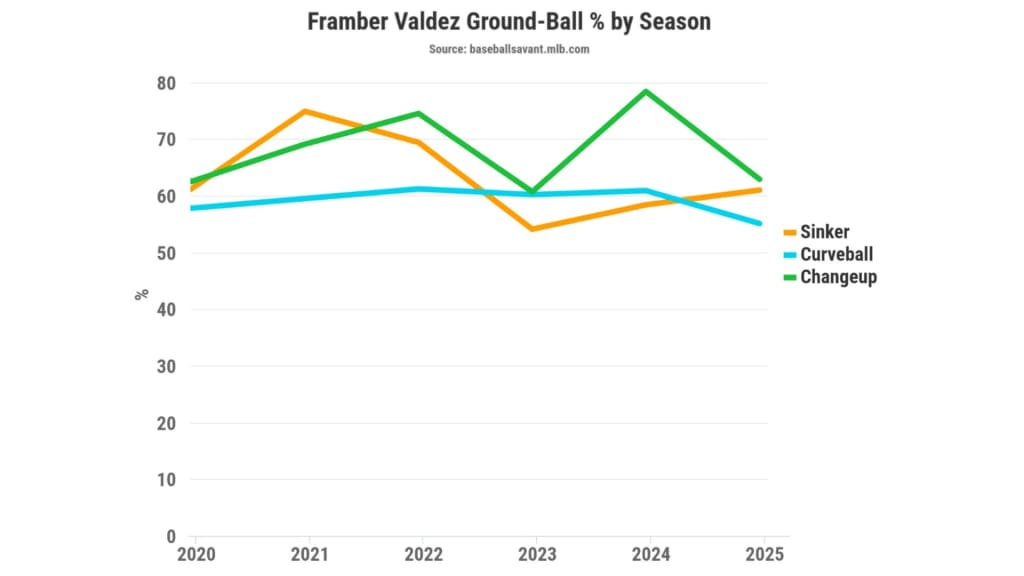 El sinker, la curva y el cambio de Valdez representan aproximadamente el 90% de sus lanzamientos cada temporada. Y los tres, individualmente, suelen generar porcentajes de rodados del 55% o más prácticamente cada año.