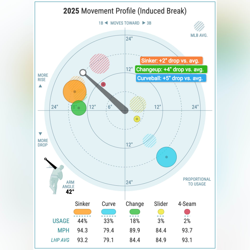 Esa combinación obliga a los bateadores a golpear la bola contra el suelo porque tanto el sinker como la curva y el cambio presentan una caída vertical considerable. Cada uno de estos tres pitcheos supera ampliamente el promedio de las Grandes Ligas en cuanto a ruptura vertical hacia abajo.