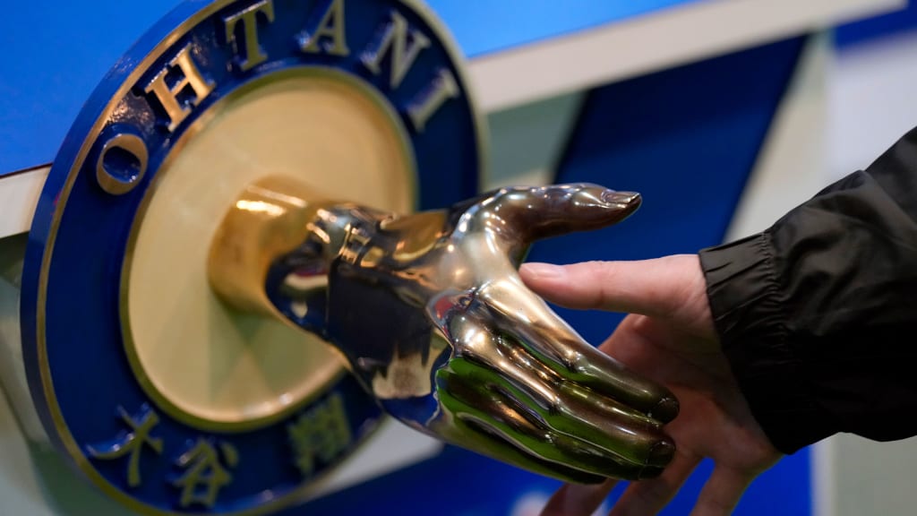 La pieza central de la colección del ayuntamiento es una réplica de la mano derecha de Ohtani. La mano dorada te permite tomarla y ver un video con Ohtani mostrando cómo se hizo la réplica.