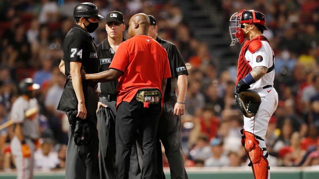 El umpire estaba de pie cuando un miembro de los auxiliares de Boston salió de la cueva y conversó con él atrás del plato.