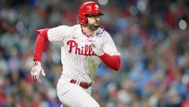 Played 65 games over two stints with the Phillies; defensively: 35 games (31 starts) in LF, 17 games (14 starts) at first base, 11 games (6 starts) in RF and one start in CF...Made his fourth career Opening Day roster and started in LF on 3/30 at TEX...Recorded his first hit as a Phillie on 4/4 at NYY and slugged his first HR with the club on 4/10 vs MIA...Drove in a career-high-tying four runs on 4/16 at CIN...Clubbed a 428-foot HR on 8/8 vs WSH (gm 1), his farthest HR since 2019...Tallied a career-high-tying three hits twice, 4/29 at HOU and 8/18 at WSH...Homered against WSH in the Little League Classic on 8/20; at 107.0 mph, it was his hardest-hit HR since 2018...Had an XBH in a career-high four straight games from 8/16-20...Homered in back-to-back games from 8/19-20 for the fourth time in his career and the first since 2019...Registered his 100th career XBH with a triple on 9/11 vs ATL (gm 2)...Hit safely in 21 straight games for Lehigh Valley (AAA) from 5/4-28 (.437/.524/.862, 1.386 OPS), tied for the fourth-longest hitting streak in franchise history...Was named International League Player of the Week for 5/22-28 and IL Player of the Month for May...Appeared in three postseason games for the Phillies as a pinch-hitter in the NLCS vs ARI and doubled to center field in Game 2 on 10/17 for his first career extra-base hit in the postseason.