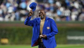 Lee Smith hace pitcheo ceremonial antes del Juego 4
