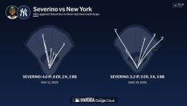 In 19 starts with the Yankees, went 7-3 with a 3.18 ERA (102.0IP, 72H, 37R/36ER, 30BB, 112K, 14HR)…opponents batted .196/.263/.353 (72-for-368, 14HR); LH .196/.243/.387 (32-for-163, 8HR); RH .195/.278/.327 (40-for-205, 6HR)...Allowed 3ER-or-fewer in 15-of-19 starts, 2ERor-fewer in 12 of those starts and one-or-zero earned runs in nine of those games…tossed five scoreless starts (0R in 5.0IP on 4/14 vs. Toronto, 0R in 7.0IP in Game 2 on 5/22 vs. Chicago-AL, 0R in 7.0IP on 6/4 vs. Detroit, 0R in 6.0IP on 7/6 at Pittsburgh and 0R in 7.0IP on 10/3 at Texas)...Tossed at least 6.0IP and allowed 1H-or-fewer in three starts: 1H in 6.0IP on 5/16 at Baltimore, 1H in 7.0IP on 6/4 vs. Detroit and 0H in 7.0IP on 10/3 at Texas…was just the second pitcher in franchise history to record at least three such starts in a single season, joining Nestor Cortes who recorded four such starts in 2022…prior to 2022, only three Yankees pitchers had recorded two such starts in the previous 20 seasons (CC Sabathia and Javier Vázquez each recorded two such starts in 2010 and AJ Burnett recorded two such starts in 2009)…his two such starts with at least 7.0IP and 1H-or-fewer matched the most by a Yankees pitcher in franchise history, joining Cortes (2022), Sabathia (2010), Burnett (2009), Orlando Hernández (2002), Scott Sanderson (1991), Whitey Ford (1955), Allie Reynolds (1951) and Bob Shawkey (1919)...The Yankees went 13-6 in his starts, winning each of his first seven starts...Held opponents to a .141/.244/.282 (10-for-71) slash line with RISP...Allowed 2BB-or-fewer in 17-of-19 starts...Received 3R-or-fewer of support in 14-of -19 starts…received 2R-or-fewer of support in 11 starts and 1R-orfewer of support in eight starts...Made ten starts at home, going 4-1 with a 3.14 ERA (51.2IP, 18ER) and 63K…allowed 3R-or-fewer in eight of his ten starts, 2R-or-fewer in six of those starts and 1R-or-fewer in five of those starts...In nine road starts, went 3-2 with a 3.22 ERA (50.1IP, 18ER) and 49K…allowed 3ER-or-fewer in seven of his nine starts and 1ER-or-fewer in four of those games...Made his season debut on 4/9 vs. Boston and did not record a decision, allowing 2ER in 3.0 innings (5H, 5K, 1HR)…marked his first start since 2019 ALCS Game 3 vs. Houston…struck out Kiké Hernández swinging to lead off the third inning to record his 600th career strikeout...Earned his first win of the year in the Yankees’ 3-0 victory on 4/14 vs. Toronto, allowing just 2H over five scoreless innings (2BB, 6K, 1HP)…marked his first win as a starter since 9/22/19 vs. the Blue Jays…marked his 14th career scoreless start and first since 9/22/19 vs. Toronto (0R over 5.0IP)…did not allow a hit to his final 15 batters faced (2BB, 1ROE)…struck out Vladimir Guerrero Jr. three times…according to the YES Network, Severino was the first pitcher to ever strike out Guerrero Jr. three times in a single game...Earned his second win of the season on 4/26 vs. Baltimore after allowing just 3H over 6.0IP (4ER, 2BB, 5K, 1HR)…marked his longest start since 9/19/18 vs. Boston (7.0IP)…retired his first 14BF before issuing a walk to Austin Hays in the fifth…did not allow a hit to his first 17BF before allowing a single to Jorge Mateo in the sixth...Went 2-1 with a 1.67 ERA (32.1IP, 6ER) and 40K over five starts from 5/16-6/10…tossed at least 6.0IP in each of those five starts after doing so just once in his first six starts of the season (6.0IP on 4/26 vs. Baltimore)…marked his longest such streak with at least 6.0IP since a career-high ten-start streak from 4/16-6/4/18-G1...Posted a 2.60 ERA (55.1IP, 16ER) and 63K in nine starts from 5/16-7/6...Went 5-3 with a 2.82 ERA (73.1IP, 23ER) in his final 13 starts of the season (5/16-10/3)...Recorded his third win of the year on 5/16 at Baltimore after allowing just 1ER over 6.0IP (1H, 2BB, 7K, 1HR, 1HP)…marked the first time since 4/16/18 vs. Miami (1H in 6.0IP) that he allowed just 1H over at least 6.0IP...Tossed seven scoreless innings in Game 2 on 5/22 vs. Chicago-AL (ND, 8H, 0BB, 5K, 2HP)…marked his longest start since 9/19/18 vs. Boston (7.0IP)…was his 15th career scoreless start and second of the season…marked his longest scoreless start since 6/26/18 at Philadelphia (7.0IP)…also set a season high in innings pitched...Recorded at least 8K in four straight starts from 5/29-6/19, the second-longest streak of his career (5GS from 8/17-9/9/17)...Notched at least 7K in five straight starts from 5/29-6/24, matching his second-longest stretch of his career (6GS from 8/17-9/15/17 and 5GS from 5/19-6/10/17)...Recorded his first loss of the season on 5/29 at Tampa Bay after allowing 4ER over 6.1IP (2H, 2BB, 8K, 2HR)…retired 18 of his first 20 batters faced…set a season high with 103 pitches, his most in a game since 9/19/18 vs. Boston (109 pitches)...With his 10K on 6/4 vs. Detroit and 10K on 6/10 vs. Chicago-NL, recorded double-digit strikeouts in back-to-back games for the fourth time in his career (also 2G from 5/30-6/4-G1/18, 5/2-8/18 and 4/13-18/17)…also marked the fourth time he recorded at least 10K and one-or-zero walks in consecutive games…joins Gerrit Cole (3G from 4/18-30/21 and 2G from 7/12-17/22) as the only pitchers in franchise history to record multiple such streaks...Earned his fourth win of the season on 6/4 vs. Detroit after allowing just 1H over seven scoreless innings (1BB, 10K)…allowed only two baserunners, surrendering a single to Miguel Cabrera in the second inning and a walk to Derek Hill in the third…after the walk to Hill, retired his final 13 batters faced…marked his 11th career double-digit strikeout game and his first since 8/31/18 vs. Detroit (10K)…was his 16th career scoreless start and third of the season…tied his season high in innings pitched...Recorded his 12th career double-digit strikeout game on 6/10 vs. Chicago-NL (ND, 6.0IP, 7H, 1ER, 1BB, 10K, 1HR)…tied his season high with 103 pitches...Was placed on the COVID-19