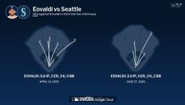 Was superb in 22 starts, going 11-3 with a 1.73 ERA (25 ER/130.0 IP), a 0.85 WHIP, a .194 opponent BA (90-for-463), and 129 strikeouts against 21 walks…campaign was interrupted by two stints on the Rangers’ Injured List – 5/29-6/26 (right posterior elbow inflammation) and 8/24-end of season (right rotator cuff strain) – which robbed him of qualifying status…Texas was 15-7 in his 22 outings, including winning each of his final nine starts from 7/2-8/22…among MLB pitchers with 130.0+ innings pitched in 2025, Eovaldi owned the lowest ERA, WHIP, and opponent on-base percentage (.239) while ranking highly in opponent OPS (second, .546), strikeout to walk ratio (second, 6.14), FIP (fifth, 2.71), and home runs per 9.0 figure (seventh, 0.69)…his 1.73 ERA was the lowest in franchise history (beg. 1961) by a Senators/Rangers pitcher through his first 22 starts of the year, ahead of Rick Honeycutt (2.32) in 1983…also was the second-lowest ERA in franchise history in a season of 130.0+ IP (1.57-Jim Kern in 1979, 143.0 IP in 71 relief appearances) and lowest by a Senators/Rangers starter… twirled a complete-game shutout on 4/1 at CIN (4 H, 0 BB, 8 SO, 99 pitches/70 strikes) in a 1-0 TEX win, the first complete-game shutout in MLB in 2025…was his second career nine-inning CG SHO, joining his three-hitter on 4/29/23 vs. NYY…first road CG SHO for TEX since Martín Pérez on 5/20/22 at HOU, first road CG SHO by a Rangers RHP since Kyle Gibson on 9/16/20 at HOU…first CG SHO by a Ranger within club’s first six games of a season since Rick Helling on 4/3/98 at TOR (Rangers’ third game of season)…earliest calendar date ever for a Rangers CG SHO (4/1)…fewest pitches in a CG SHO by a TEX pitcher since Colby Lewis on 9/11/15 vs. OAK (97)…went 5-0 with a 0.59 ERA (2 ER/30.2 IP) over five starts in July, posting the second-lowest monthly ERA for a Texas pitcher in club history (min. 30.0 IP) to only Yovani Gallardo’s 0.54 mark in June of 2015…capped month with his 100th career W on 7/30 at LAA (7.0 IP, 6 H, 1 R-ER)…was strong through his first four GS of Aug. (2-0, 2.67 ERA, QS with 7.0+ IP in three of four GS) but was placed on 15-day IL on 8/27 (retro to 8/24) with a right rotator cuff strain…experienced soreness following start on 8/22 vs. CLE (7.0 IP, 4 H, 1 R-ER, 0 BB, 9 SO), and imaging revealed strain… news was announced by Rangers President of Baseball Operations, Chris Young, on 8/26, with Eovaldi landing on IL the next day… allowed one-or-zero runs in seven consecutive starts, 4/25-5/27, the longest streak in franchise history (beg. 1961)…went 7-0, 1.56 (10 ER/57.2 IP) in his final nine GS from 7/2-8/22, marking the third longest win streak of his career: 9-0 in 13 GS from 6/20-8/30/15 with NYY, 8-0 in 10 GS from 4/18-6/10/23 with TEX…Rangers won his last nine starts of the year, longest streak of team wins by a single Texas pitcher since Cole Hamels in 2015 (TEX went 10-0 in 10 starts, 8/17-10/4/15)…boasted MLB’s third-lowest ERA in games following team loss (min. 10 GS): 6-2, 1.83 ERA (15 ER/73.2 IP) in 12 starts after a TEX defeat…was stingy against both RHB (.186/.230/.282/.512) and LHB (.202/.248/.329/.577)…had 2.15 ERA (14 ER/58.2 IP) in 11 home starts (eighth in MLB, min. 10 GS) and a 1.39 ERA (11 ER/71.1 IP) in 11 road outings (first in MLB, min. 10 GS)…his 1.39 ERA on the road was by far the best figure in WSH/TEX franchise history (min. 10 GS), surpassing Bert Blyleven’s 1.95 mark in 1977 (13 GS).