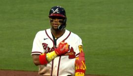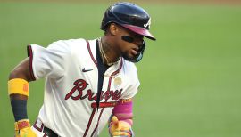 Awards: Louisville Slugger Silver Slugger (OF), Second Team All-MLB (OF), Luis Aparicio Award...The Luis Aparicio Award is given annually to the best performance in a season by a Venezuelan-born major-league player… The award is voted on by Venezuelan and international Spanish-speaking members of the media that cover baseball…Acuña Jr. was the co-winner of this award in 2018 w/ Milwaukee’s Jesús Aguilar...N.L. Ranks: AB/HR (11.43, 1st), OPS (.987, 5th), on-base % (.406, 7th), slugging % (.581, 8th), walks (38, T6th)...Was one of three Rawlings Gold Glove finalists for N.L. centerfielders…Had no errors in 61 total chances, across 215.0 innings in 34 games (30 starts)...Also appeared in 28 games (16 starts) in right field and had no errors in 41 total chances at that position…Was worth 0.4 defensive bWAR and has 1.3 total defensive bWAR in his three-year career...Hit four leadoff home runs, batting out of the leadoff spot in all 46 games he started…Only the Yankees’ DJ LeMahieu had more such homers (5)...Has a franchise-record 19 leadoff homers in his career…Felipe Alou held the previous record with 17, doing so in 633 games leading off…Acuña Jr. broke the record, hitting his 18th leadoff homer on 9/5 vs. Washington in his 210th game atop the Braves lineup…That was his 293rd career game, and no player in majorleague history had more leadoff homers through their first 300 career games...It was Acuña Jr.’s third major-league season…That is also the most leadoff homers through a player’s first three seasons in history…Barry Bonds held the previous record, hitting 16 in his first three seasons (1986-88)...One of his leadoff home runs came on 8/26 in Game 1 of a doubleheader against the Yankees…He took Gerrit Cole deep, hitting a homer that traveled a projected 473 feet, the second longest of his career, and the second longest by a Braves player in the Statcast era (since ’15)...His only longer career home run was another leadoff homer, on 9/25 off Boston’s Chris Mazza…It went to the back row of the left-field bleachers, traveling a projected 495 feet, the longest homer in the majors in 2020 and the farthest homer ever hit at Truist Park…There have been just four longer homers since Statcast was introduced – Nomar Mazara, 505 feet in 2019, Giancarlo Stanton, 504 feet in 2016, Aaron Judge, 496 feet in 2017 and Miguel Sanó, 496 feet in 2019...Half of his home runs (7) came in six doubleheader games…He twice hit three home runs in a doubleheader, doing so on 8/9 at Philadelphia and 9/4 vs. Washington…He is first Braves player to hit three homers in a doubleheader twice in a season since Joe Torre in 1965 and 1967...Before Acuña Jr., the last Braves player with three home runs in a doubleheader was OF David Justice on 8/7/90 vs. San Diego…Justice hit a solo homer in game one, before going 4-for-4 with two homers in the nightcap...Justice also hit two more home runs the following day… Acuña Jr. has now homered in both ends of a doubleheader three times in his career (also, 8/13/18 against Miami)...Featured among his 14 home runs were his 70th and 80th career homers…His 70th came in Game 2 of a doubleheader on 8/9 at the Phillies, in his 248th career game…He became the third quickest player to 70 home runs by games played in franchise history, trailing Bob Horner (260 games) and Eddie Mathews (283)...He hit his 80th homer on 9/20 at New York-NL, in his 307th game…Only six players in the history of the game reached that total in fewer games played (Joe DiMaggio, Bob Horner, Ryan Howard, Aaron Judge, Chuck Klein and Gary Sánchez)...Drew 38 walks, tied for the sixth most in the N.L., despite playing in fewer games than everyone ahead of him on that list…Acuña had 23 walks in September, the fourth most in the league...His 18.8% walk rate was fourth in the majors, trailing Washington’s Juan Soto (20.9%), Philadelphia’s Bryce Harper (20.1%) and New York-AL’s Aaron Hicks (19.4%)...This total was nearly double his previous career best (10.6% in 2019)...Drew a walk in a career-most six straight games, from 8/2-8...Reached base safely four or more times in five games this season, one off the major-league lead held by four players including teammate Freddie Freeman…Since his debut year in 2018, he has reached safely in a game at least four times on 35 occasions...Played in his 300th career game on 9/12 at Washington…Had 78 home runs and 58 stolen bases at the time of the game…Is the only player in major-league history to reach 75 home runs and 50 stolen bases by his 300th career game...Had career bests in average exit velocity (92.4) and hard-hit rate (57.0%), the latter of which was fourth in the majors, trailing just Fernando Tatis Jr (62.2%), Travis d’Arnaud (57.8%) and Miguel Sanó (57.3%)...In the Braves’ record-setting 29-9 win over Miami on 9/9, had a single, double, home run, three walks and drove in a single-game career-best five…Became just the fourth player in the N.L. since 1901 to record at least three hits, three walks and five RBI in a game, and the first to do so since Cincinnati’s Sean Casey on 5/19/99 at Colorado (4 H, 3 BB, 6 RBI, 5 R)...Missed 10 games with left wrist inflammation… Was sidelined from 8/12-25…The Braves were just 5-5 (.500) in those games…Conversely, Atlanta went 30-20 (.667) in all other games...Made his second career Opening Day start… At 22, became the youngest Braves OF to start consecutive Opening Day games since Andruw Jones, who started three straight from 1997-99 (Age 19-21).