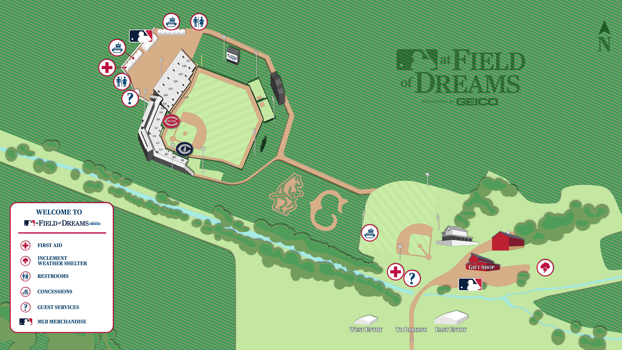 Official MLB Merchandise trailers will be placed throughout the site, including two at the main entrance next to the red barn with additional locations on the concourse and program stands will be located throughout the venue. The locations will feature an assortment of merchandise including event specific merchandise including commemorative programs, men's, women's and kids t-shirts, headwear, novelty items including pins, key chains, and pennants, along with collectors' items celebrating the uniqueness of this game. There will also be an assortment of Chicago Cubs and Cincinnati Reds in-line product.