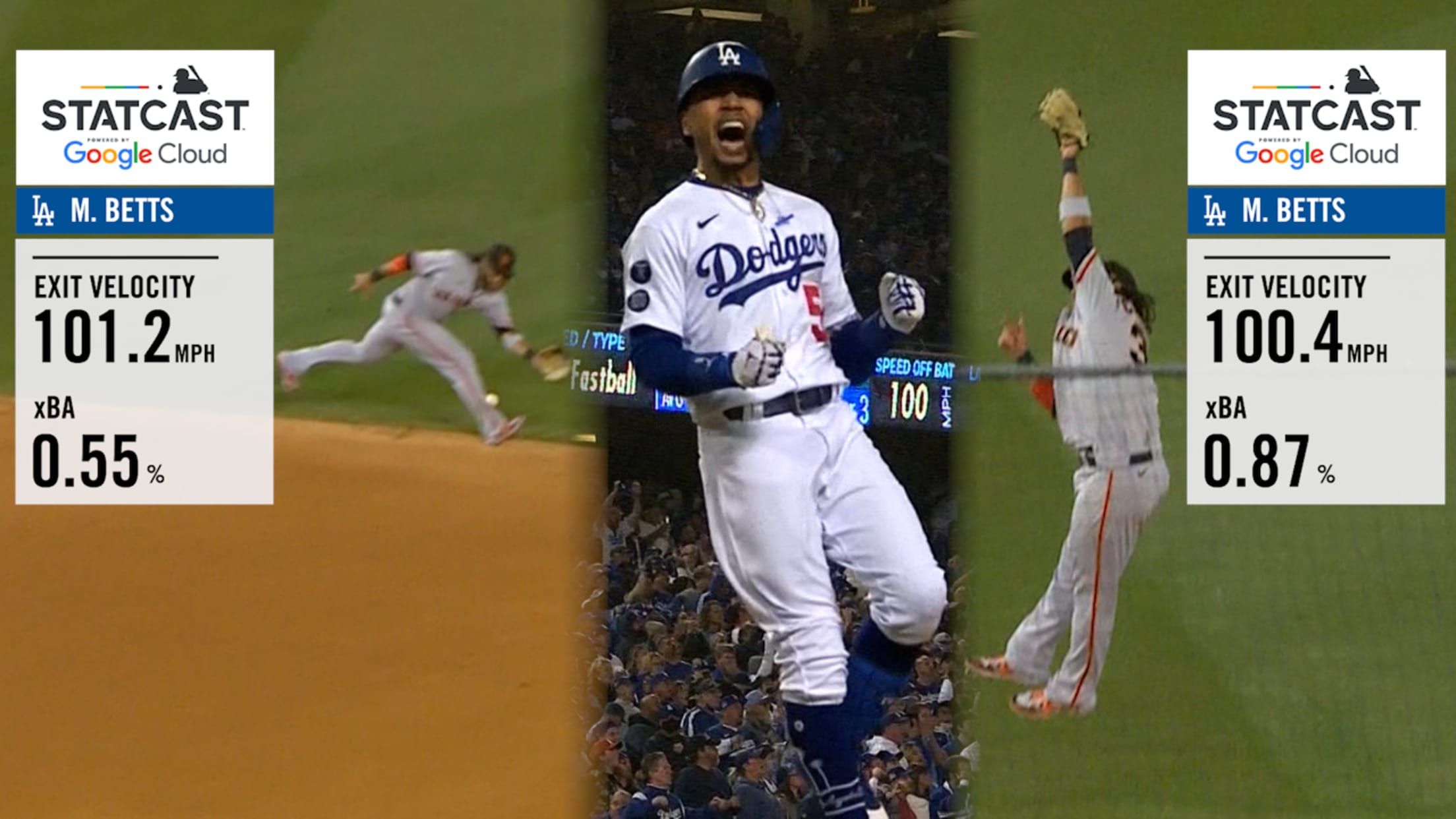 Statcast measures the exit velocity on a pair of batted balls by Mookie Betts that Brandon Crawford turned into spectacular outs in Game 3