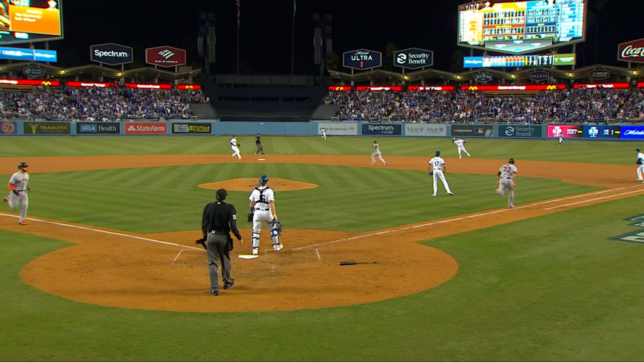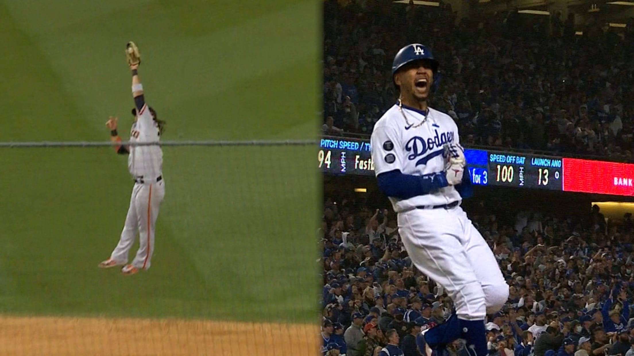 Mookie Betts rips a line drive towards Brandon Crawford, who times his jump perfectly to make the catch and end the threat in the 7th