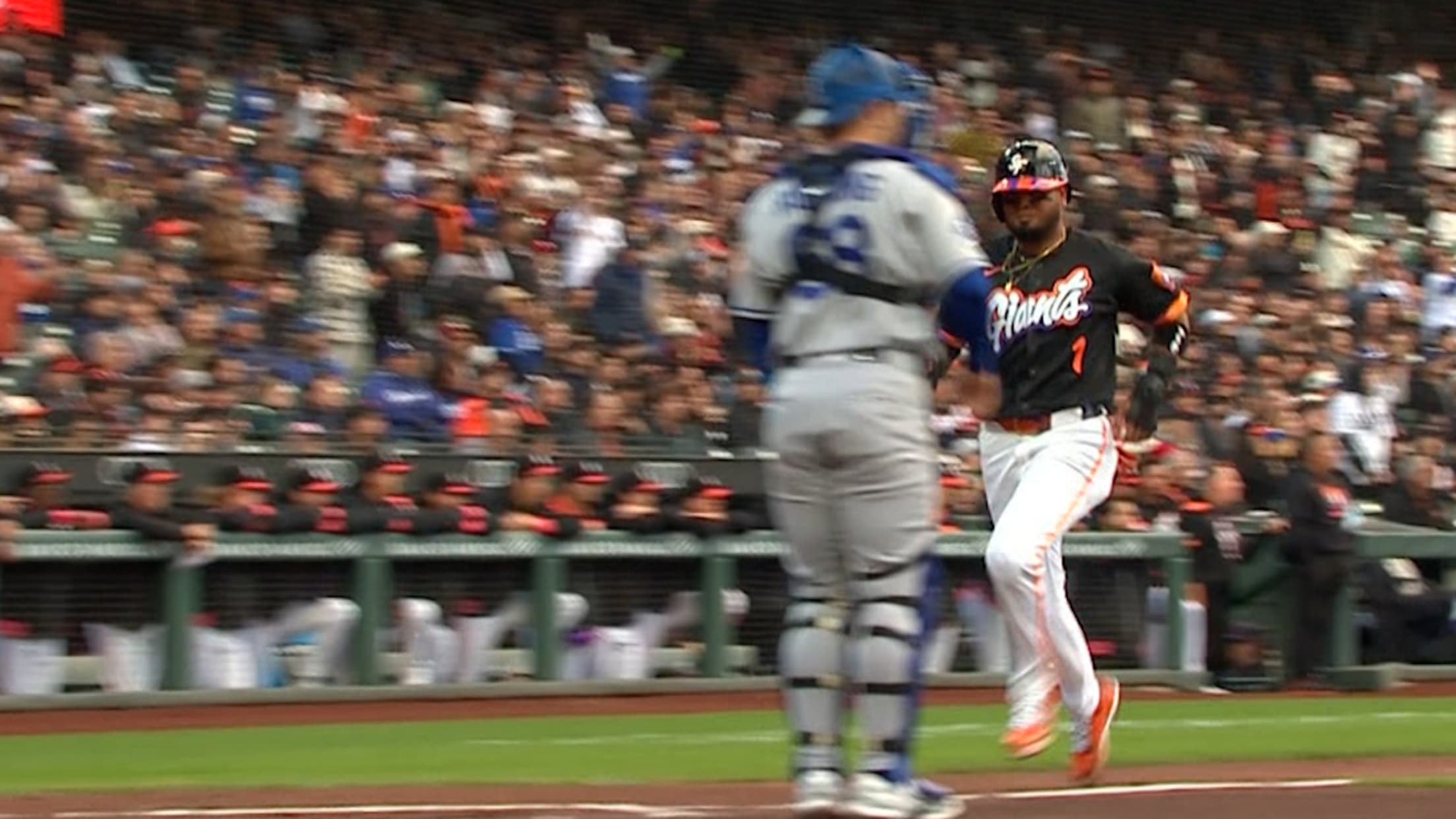 Joey Bart throws out Mookie Betts at second on a steal attempt and the call stands after a Dodgers challenge in the top of the 1st inning