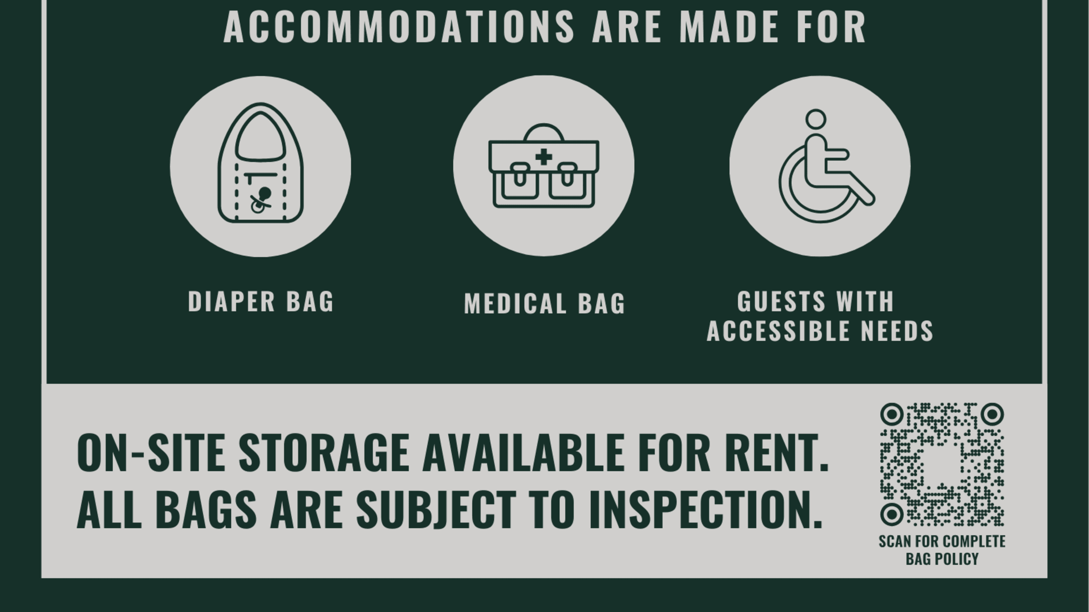 - Backpacks (including clear backpacks). Accommodations are made for diaper bags, medical bags and guests with accessible needs. Click here for the full policy.