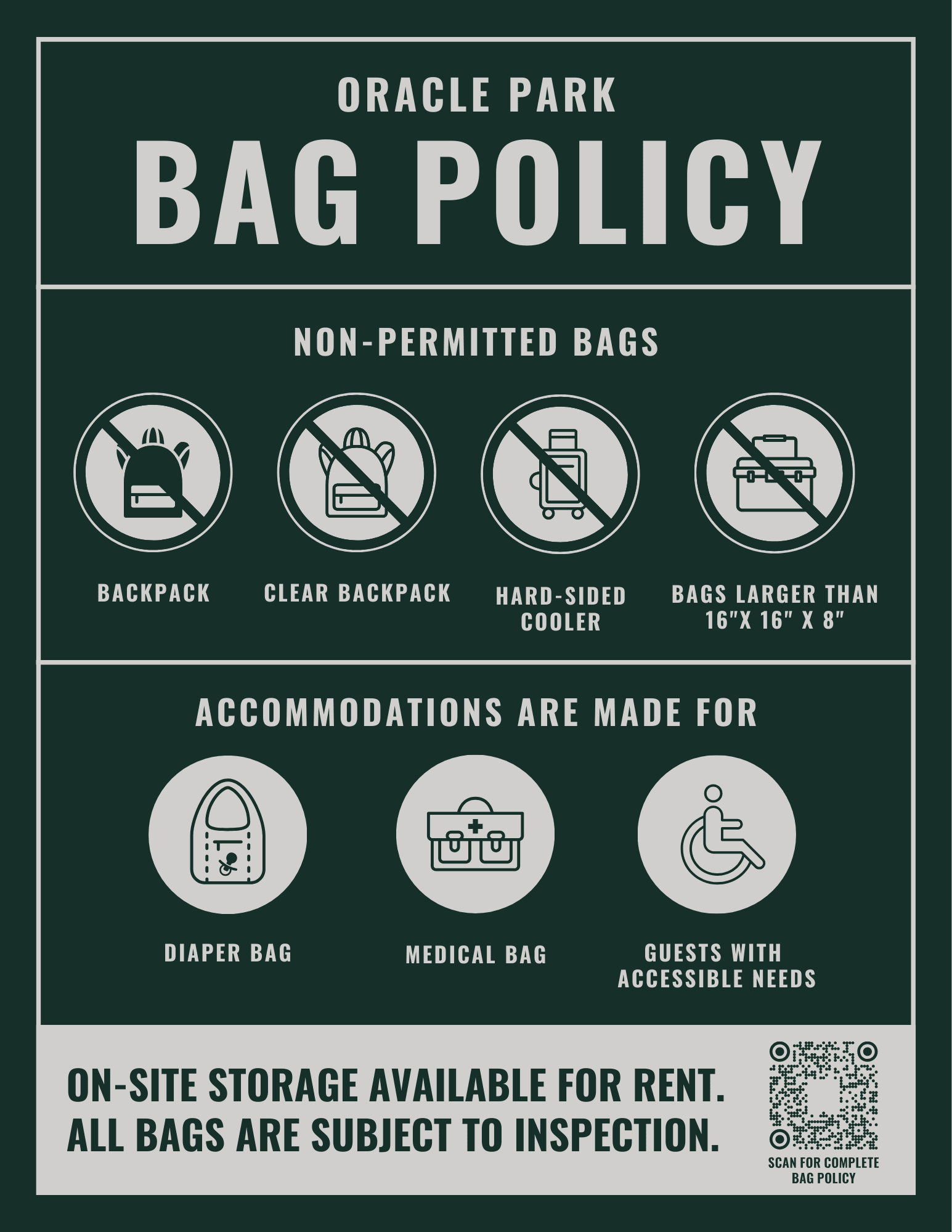 Backpacks (including clear backpacks) are NOT permitted inside Oracle Park. Accommodations are made for diaper bags, medical bags and guests with accessible needs. Otherwise this policy is strictly enforced and exceptions will not be made. Other bags, that do not exceed 16" x 16" x 8" in size, are permitted: paper and plastic grocery bags, purses, drawstring bags, fanny packs, lunch bags, briefcases, diaper bags, soft-sided coolers, and handbags. Hard-sided coolers are not permitted. Bags do not need to be clear.