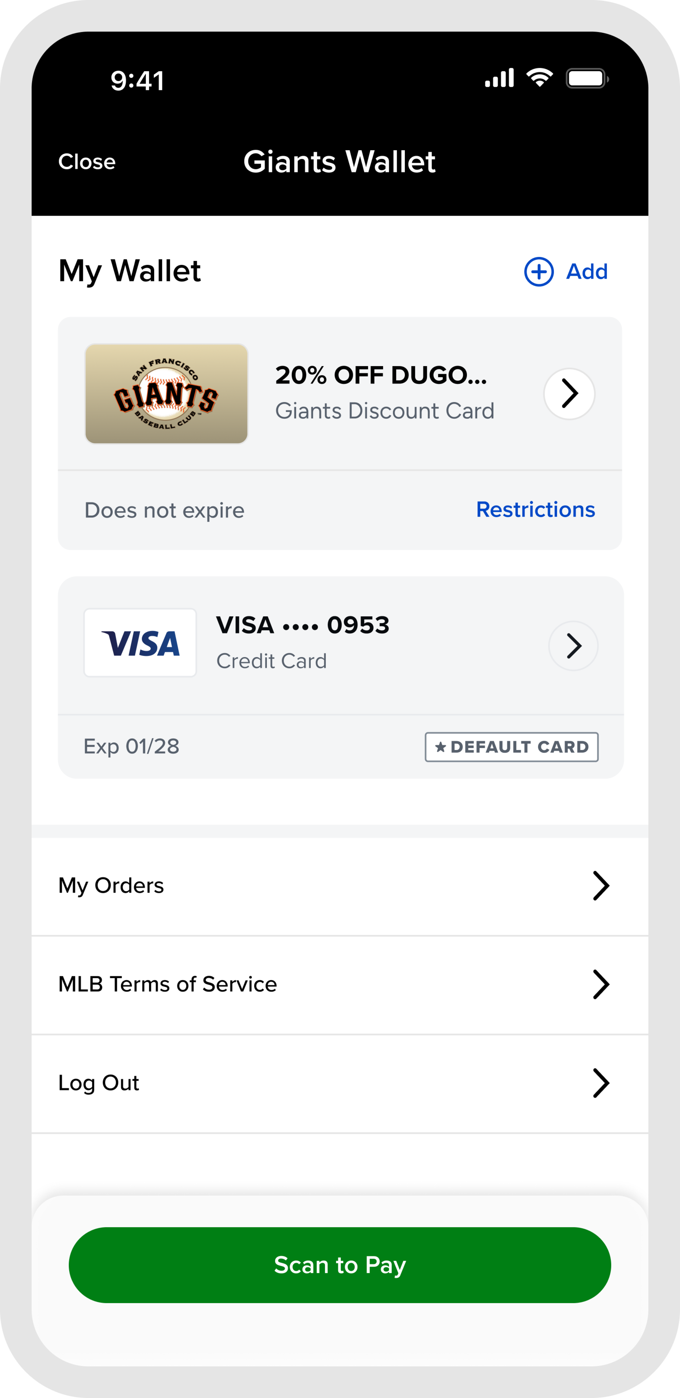 Giants Wallet provides a seamless way for fans to manage their ticket entitlements and concession credit in one centralized wallet experience. Giants Wallet is available to fans using the MLB Ballpark app at Oracle Park concession and retail locations, some restrictions may apply based on the credit or discount. Please see Terms of Use and Privacy Policy for more information.