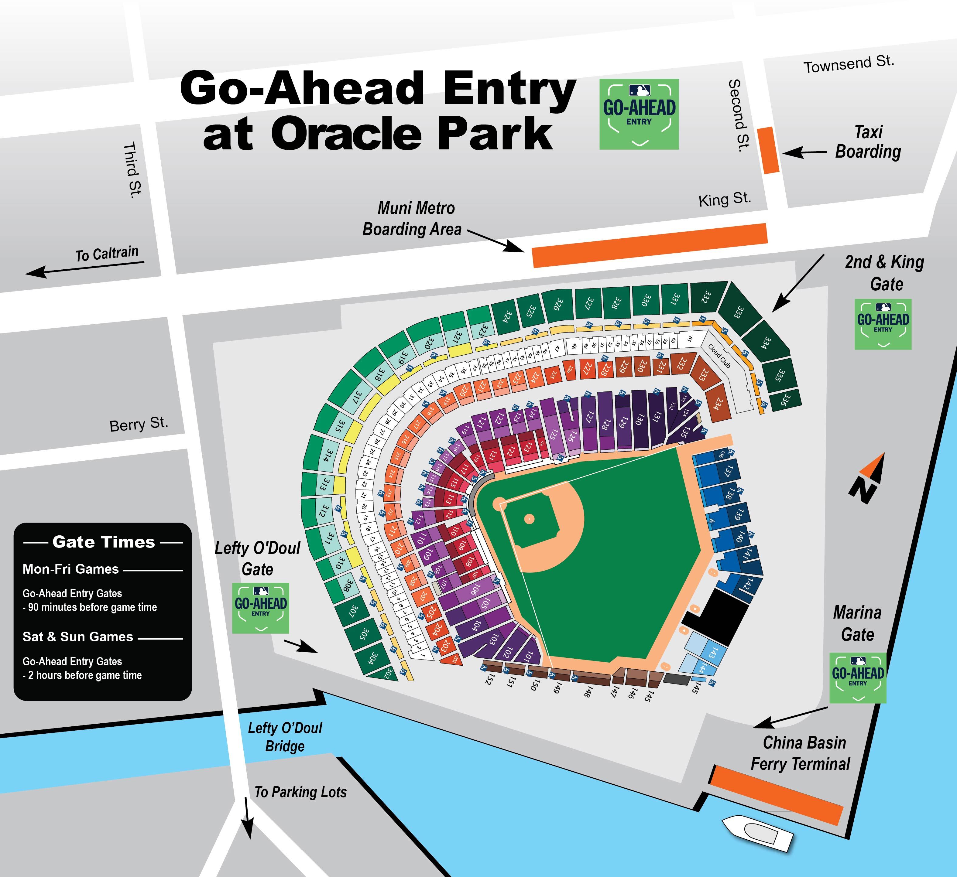 Go-Ahead Entry is available at the Lefty O’Doul Gate, 2nd & King Gate and Marina Gate. Click here to see a map.