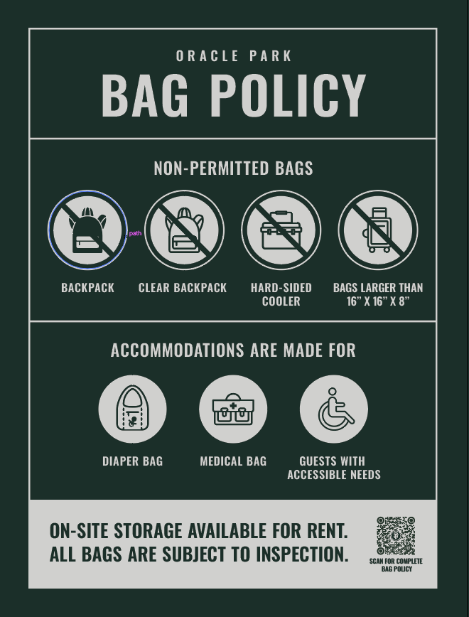 Backpacks (including clear backpacks) are NOT permitted inside Oracle Park. Accommodations are made for diaper bags, medical bags and guests with accessible needs. Otherwise this policy is strictly enforced and exceptions will not be made. Other bags, that do not exceed 16" x 16" x 8" in size, are permitted: paper and plastic grocery bags, purses, fanny packs, lunch bags, briefcases, diaper bags, soft-sided coolers, and handbags. Hard-sided coolers are not permitted. Bags do not need to be clear.