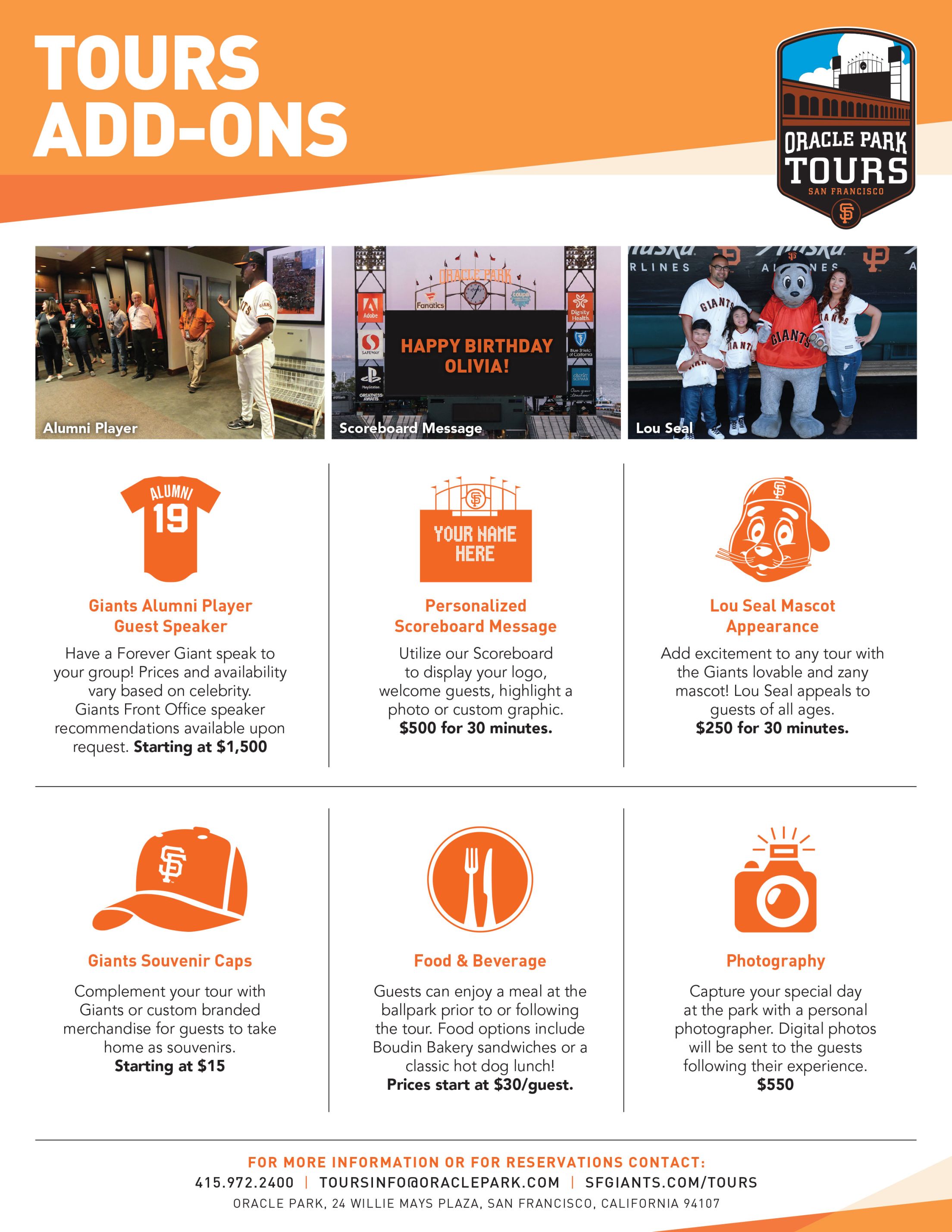 It's the ballpark where home runs can be "splash hits." The breathtaking Bay views rival the action on the field. Where one of baseball's most hallowed franchises plays inside an architectural landmark. On your 1 hour & 30 minute Private Behind-the-Scenes Ballpark Tour of sensational Oracle Park, home of the San Francisco Giants, you'll go places only the players and coaches go: the Giants' dugout, the Visitors' Clubhouse, even the field.