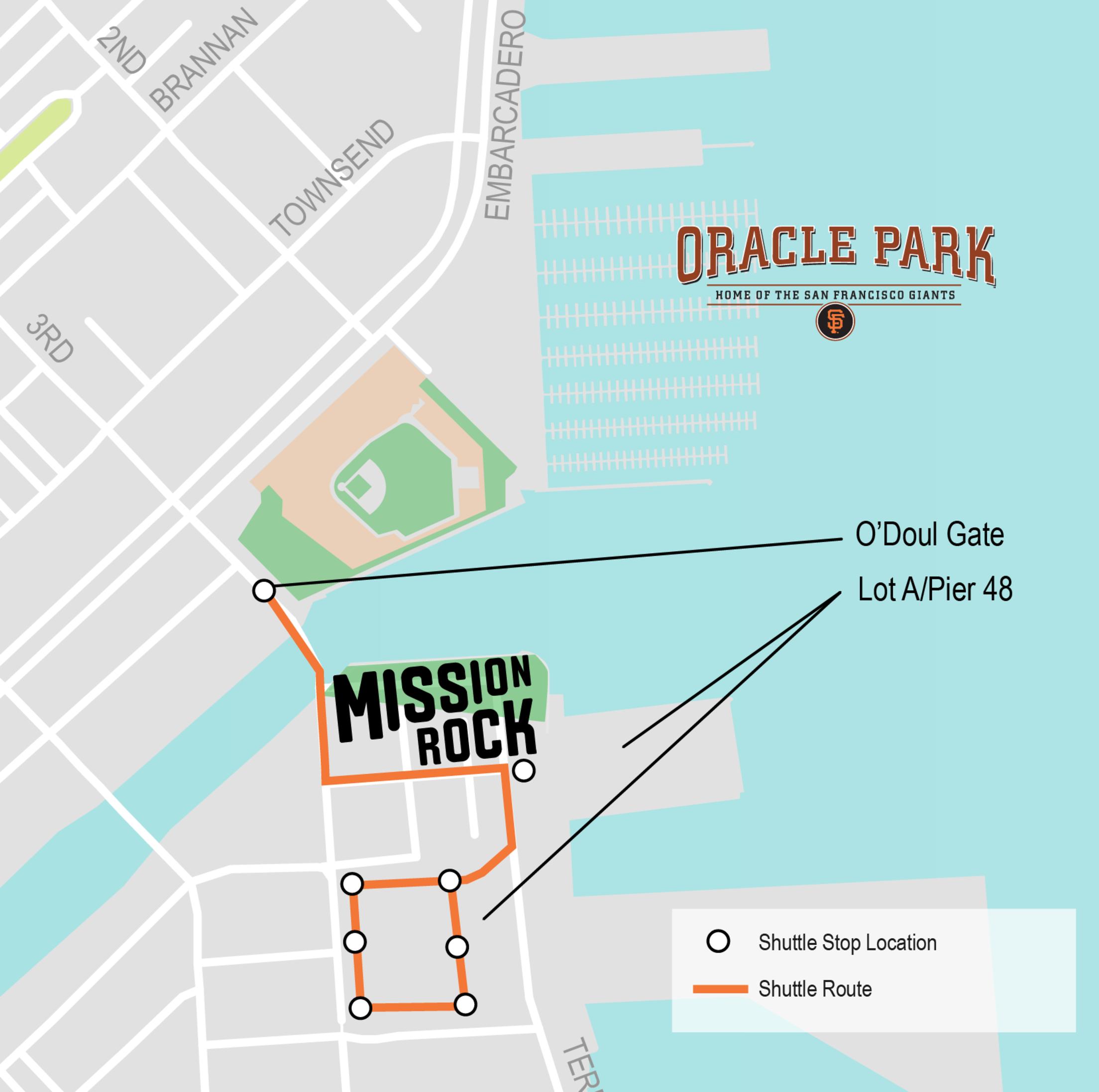 The Oracle Park Accessibility Shuttle provides a free ride for those who need it between Lot A/Pier 48 and Oracle Park. The shuttle serves multiple stops within Lot A/Pier 48 and a ballpark stop at O’Doul Gate.
