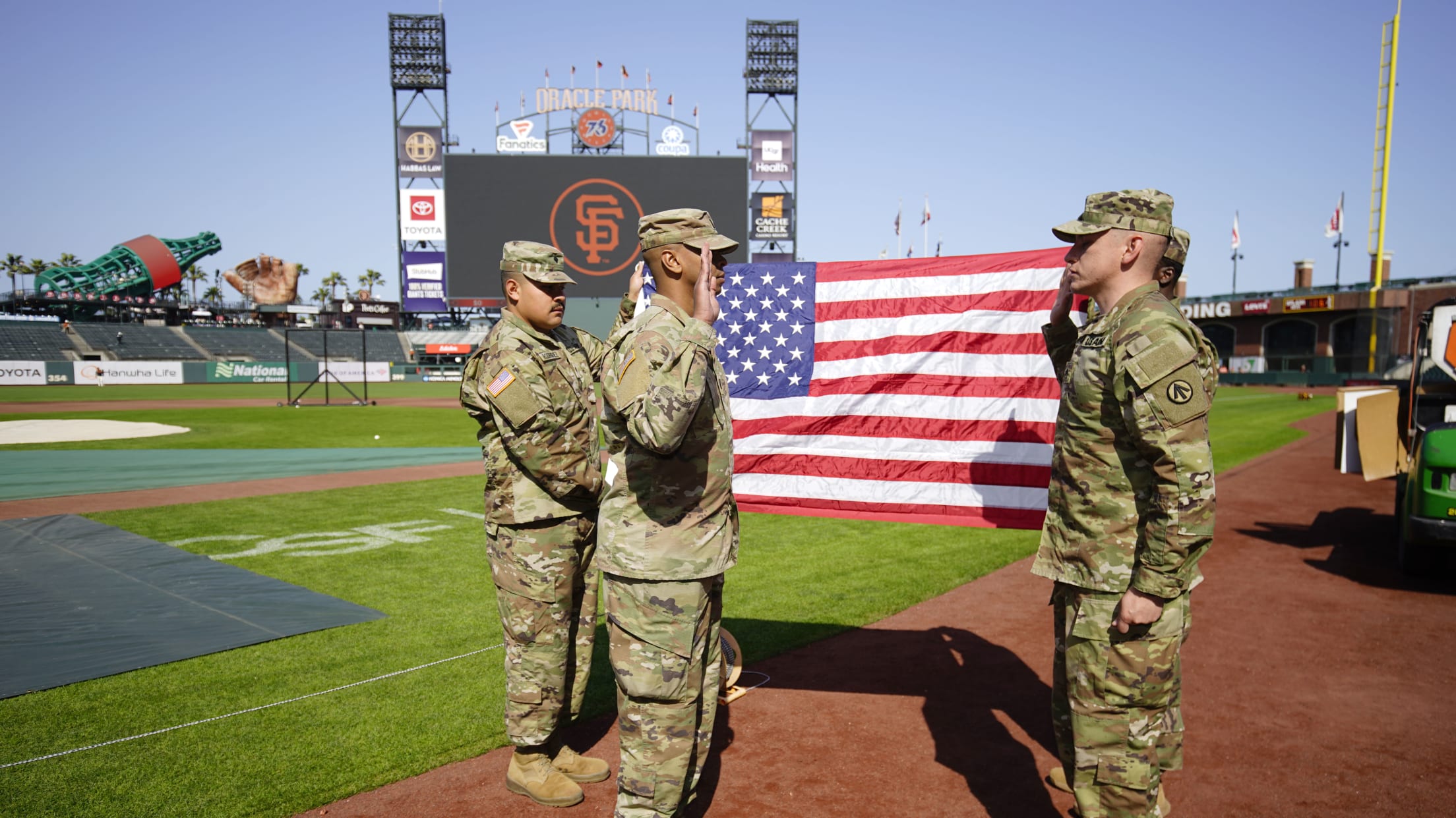 The Giants are proud to work with active-duty and veteran organizations to host military members and families for on field visits, special experiences, re-enlistment ceremonies and more throughout each season. For veteran discounts on Giants tickets, see below. For any other inquiries, contact donations@sfgiants.com.