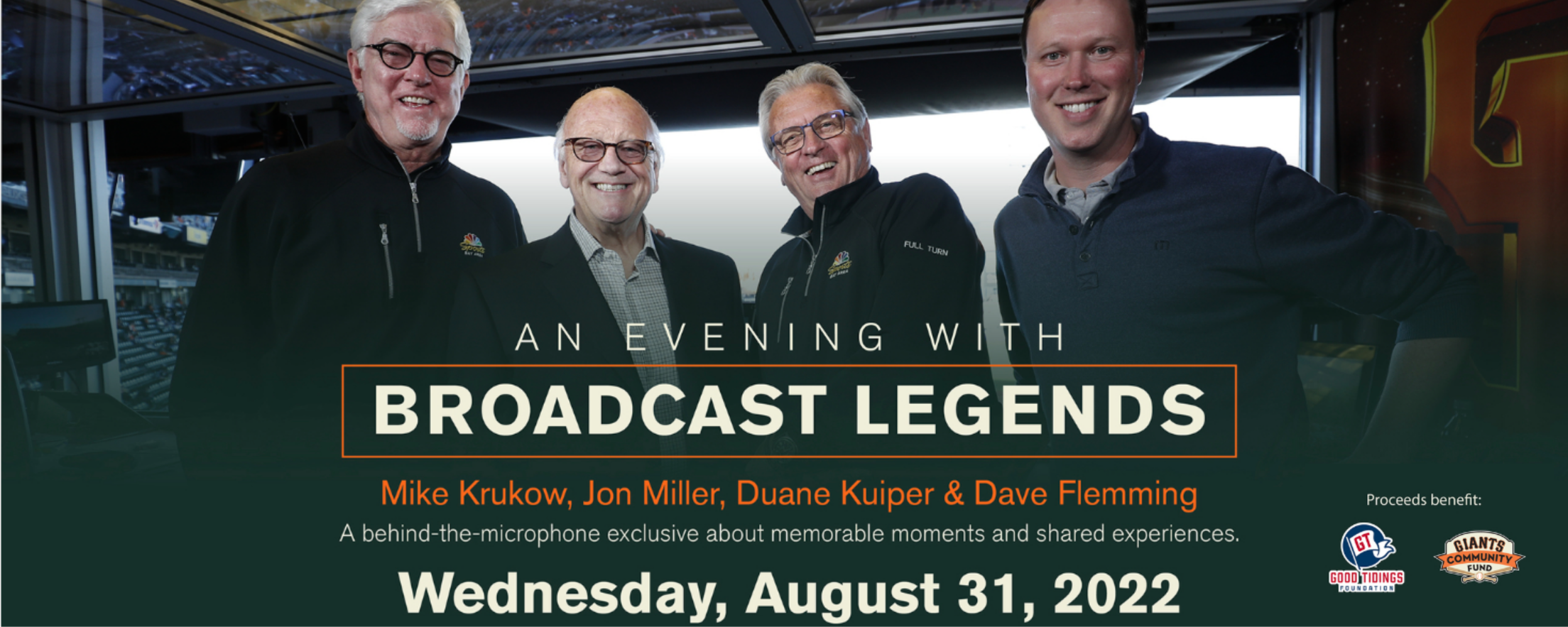 Join us for An Evening With Broadcast Legends featuring Giants Broadcasters: Dave Flemming, Mike Krukow, Duane Kuiper and Jon Miller. This is your exclusive opportunity to be up close and listen to shared experiences and memorable moments from behind the microphone. Tickets include food, drinks and a commemorative item. This evening will only be open to a limited number of attendees. Proceeds benefit the Giants Community Fund and Good Tidings Foundation.