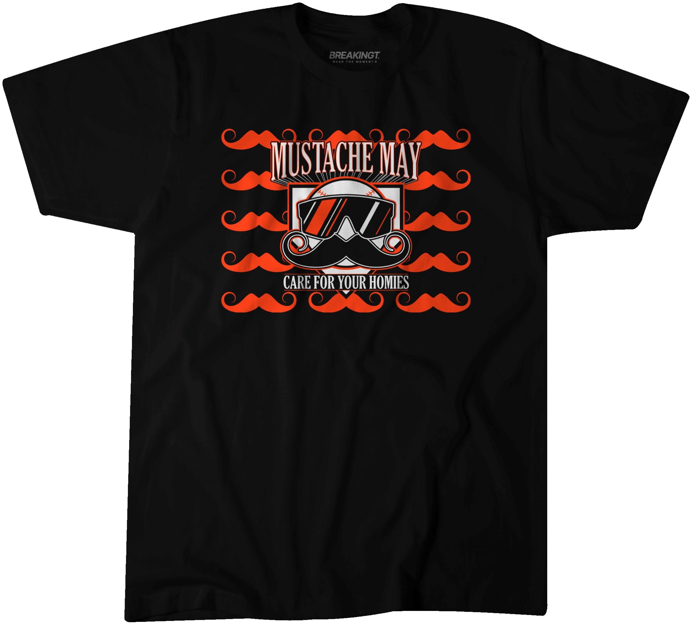 Mustache May is a campaign led by Giants outfielder Mike Yastrzemski with support from his teammates. Giants grow their mustaches to spark conversations about prioritizing mental health. Mustache May T-Shirts are available for purchase, with partial proceeds benefiting longtime Giants community partner Heart & Armor, an organization focused on mental health and community support for veterans.