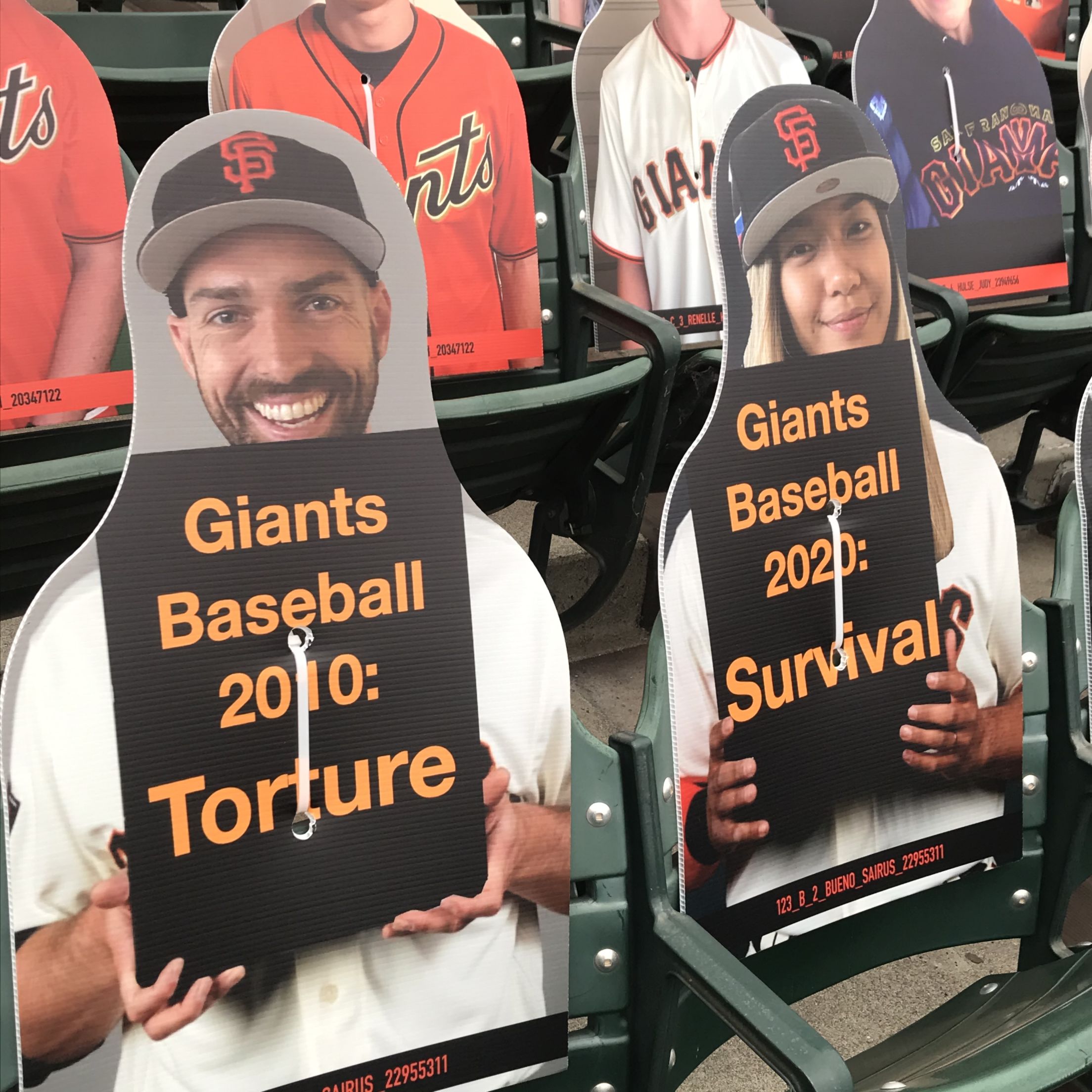 We still wear the giraffe suits from time to time and really enjoy all the smiles the outfits get. Like everyone else, we’re bummed that we can’t be at the ballpark this year. We miss it and our Giants. But we’re happy that our cut outs are there to virtually cheer on our favorite player and our favorite team! And hopefully we’ll see “the Baby Giraffe” back in the lineup soon!