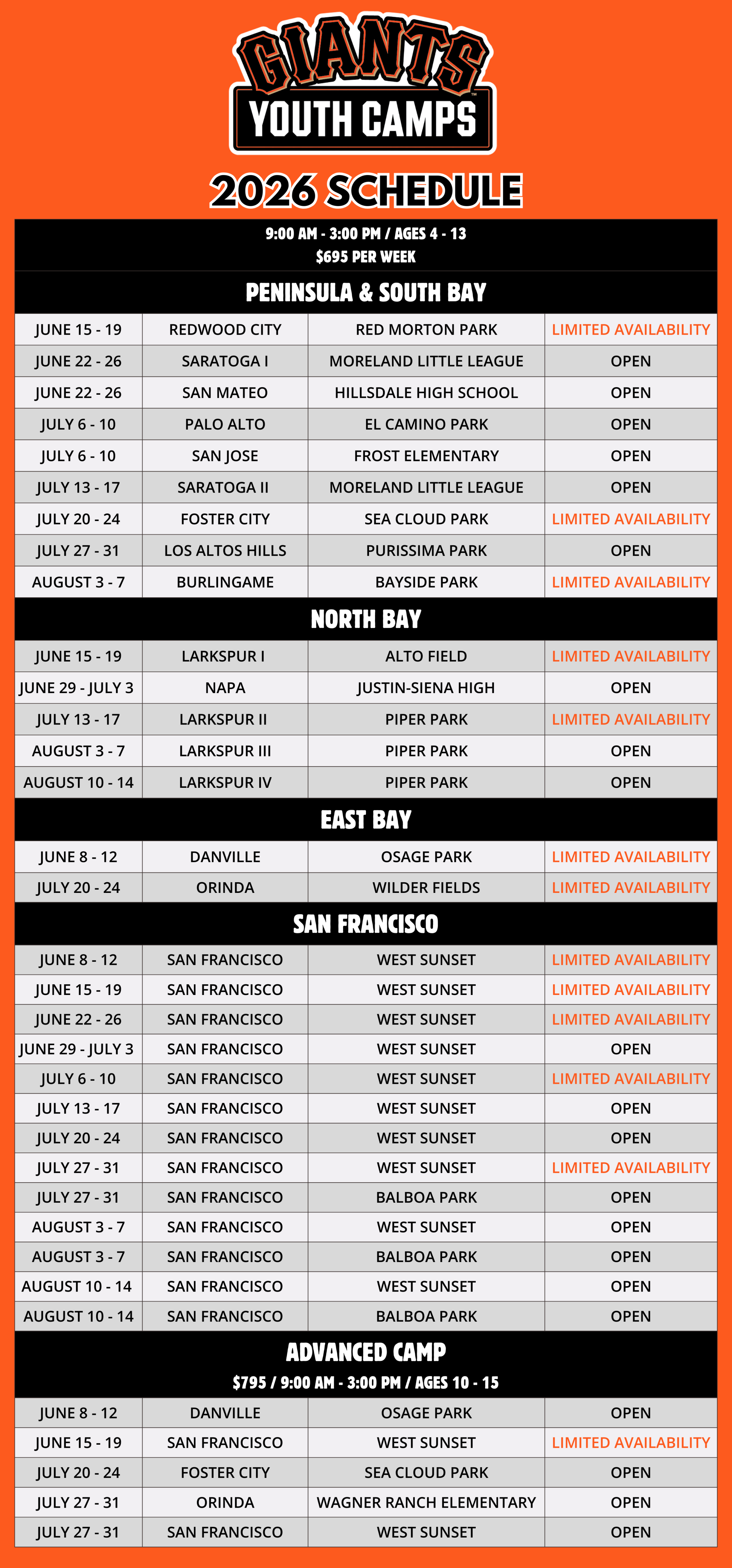 Giants Baseball Camps are offered for kids ages 4-13 of all skill levels. Each camp session is week-long (Monday-Friday) from 9:00 AM - 3:00 PM.