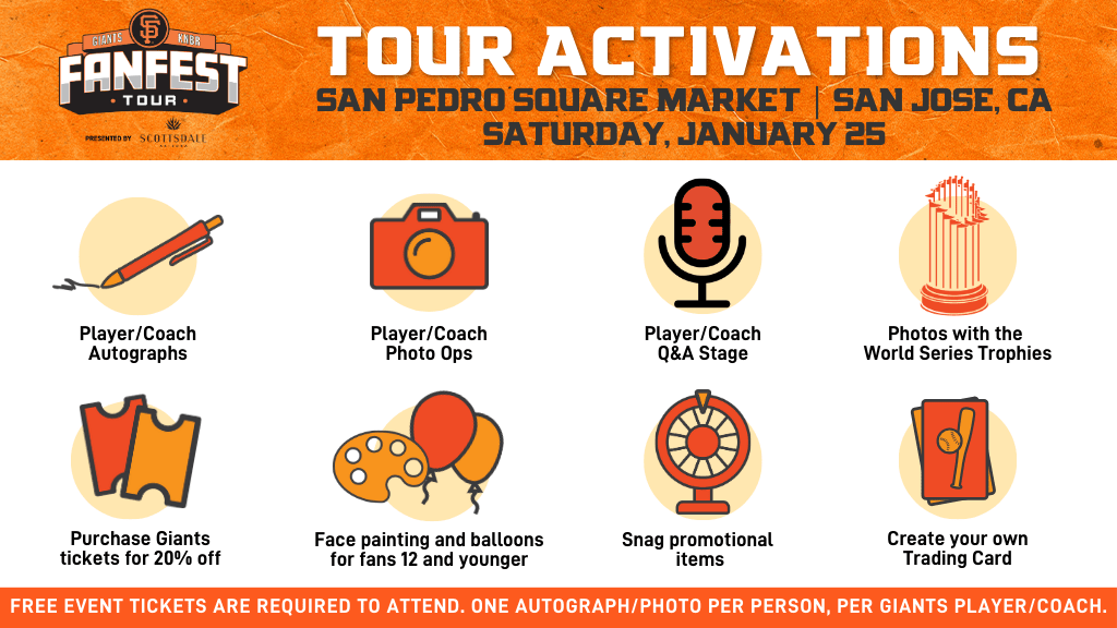 Current Giants players, coaches and Lou Seal will caravan to meet fans in San Jose to sign autographs, participate in Q&A sessions, take photos and more.