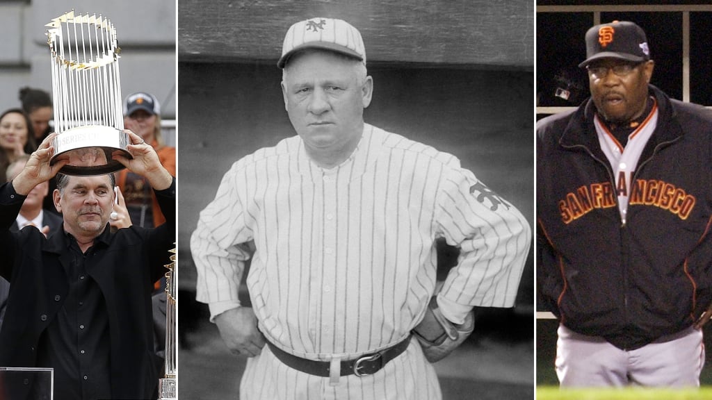 \n","providerName":"Twitter","providerUrl":"https://twitter.com","thumbnail_url":null,"type":"oembed","width":550,"contentType":"rich"},{"__typename":"Markdown","content":"• **Giants' All-Time Team:** C | 1B | 2B | 3B | SS | LF | CF | RF | UTL | RHP | LHP | Relievers\n\n_Here is Maria Guardado’s ranking of the Top 5 managers in Giants history:_","type":"text"},{"__typename":"Markdown","content":"**1) John McGraw, 1902-32** \n_Key fact: Ranks as the franchise’s all-time winningest manager with 2,583 wins_\n\nMcGraw is second to only A’s legend Connie Mack (3,731) on the all-time managerial wins list, but even Mack once declared, “There has been only one manager -- and his name is McGraw.”\n\nAfter playing third base for the Orioles and Cardinals for over a decade, a 29-year-old McGraw joined the New York Giants as a player-manager during the 1902 season. He quickly became one of the most towering figures of the era, turning the Giants into perennial winners who captured 10 National League pennants, three World Series championships and posted a .591 winning percentage over his 31-year run as manager. With McGraw at the helm, the Giants finished in first or second place 21 times in his 29 full seasons as skipper.\n\nAn innovative strategist, McGraw had a penchant for acquiring and developing players who fit into his system, which emphasized strong pitching, solid defense and aggressive baserunning. He was also known for his short temper. Nicknamed “Little Napoleon,” the fiery McGraw was tossed from 131 games during his Major League career, a record that stood until the Braves’ Bobby Cox surpassed it in 2007. McGraw was inducted into the Hall of Fame in 1937.","type":"text"},{"__typename":"Markdown","content":"**2) Bruce Bochy, 2007-19** \n_Key fact: Only the fifth manager to lead a team to three titles in a five-year span, joining Mack, Joe McCarthy, Casey Stengel and Joe Torre_\n\nBochy appears destined for Cooperstown after guiding the Giants to three World Series titles over his 13-year tenure in San Francisco. Bochy, who stepped down at the end of last season, posted a 2,003-2,029 record over his 25-year managerial career, including a 1,052-1,054 mark with the Giants, who hired him away from the Padres in October 2006. Bochy is one of 11 managers to record 2,000 wins and one of nine to win three or more championships; the others are enshrined in the Hall of Fame.\n\nOverall, Bochy led his teams to four NL pennants and recorded a 44-33 (.571) mark in the postseason. Only Torre (84 wins), Tony La Russa (70) and Cox (67) have more postseason victories than Bochy. His 1,052 wins are the second most by a Giants manager, behind only McGraw.","type":"text"},{"__typename":"Video","contentDate":"2019-09-29T19:30:37.934Z","preferredPlaybackScenarioURL({\"preferredPlaybacks\":\"mp4AvcPlayback\"})":"https://cuts.diamond.mlb.com/FORGE/2019/2019-09/29/448b660b-64411d6f-ce3c88df-csvm-diamondx64-asset_1280x720_59_4000K.mp4","type":"video","description":"Giants fans give Bruce Bochy a foghorn salute before his final game","displayAsVideoGif":false,"duration":"00:01:51","slug":"giants-fans-salute-bochy","tags":[{"__typename":"GameTag"},{"__typename":"TeamTag","slug":"teamid-137","title":"San Francisco Giants","team":{"__ref":"Team:137"},"type":"team"},{"__typename":"TaxonomyTag","slug":"highlight","title":"highlight","type":"taxonomy"},{"__typename":"TaxonomyTag","slug":"in-game-highlight","title":"in-game highlight","type":"taxonomy"},{"__typename":"InternalTag","slug":"season-2019","title":"Season 2019","type":"season"},{"__typename":"TaxonomyTag","slug":"international-feed","title":"International Partner feed","type":"taxonomy"},{"__typename":"TaxonomyTag","slug":"eclat-feed","title":"Eclat feed","type":"taxonomy"}],"thumbnail":{"__typename":"Thumbnail","templateUrl":"https://img.mlbstatic.com/mlb-images/image/private/{formatInstructions}/mlb/u3w4vi1ulgsqynrlofkd"},"title":"Giants fans salute Bochy","relativeSiteUrl":"/video/giants-fans-salute-bochy"},{"__typename":"Markdown","content":"**3) Dusty Baker, 1993-2002** \n_Key fact: Won three NL Manager of the Year Awards with the Giants, the most of any skipper in franchise history_\n\nA two-time All-Star outfielder with the Dodgers, Baker joined the Giants’ coaching staff in 1988 and served as a hitting coach for four seasons before being tapped to succeed Roger Craig ahead of the '93 campaign. In his first year as the Giants’ manager, Baker helped engineer one of the greatest turnarounds in franchise history, inheriting a 72-90 club and guiding it to a 103-59 finish. His Giants teams went on to capture two division titles, a Wild Card berth and an NL pennant, which culminated in a seven-game loss to the Angels in the 2002 World Series. Baker posted an 840-715 record over his 10 years in San Francisco, compiling the third-most wins in club history behind Bochy and McGraw.","type":"text"},{"__typename":"Markdown","content":"**4) Leo Durocher, 1948-55** \n_Key fact: Elected to the National Baseball Hall of Fame as a manager in '94_\n\nAfter serving a one-year ban for “an accumulation of unpleasant incidents,” the brash Durocher made the unexpected jump from the Brooklyn Dodgers to the New York Giants in 1948. Durocher ended up enjoying his greatest triumphs with the Giants, the team that had inspired his famous phrase, “nice guys finish last.” In 1951, Durocher oversaw the famed Miracle of Coogan’s Bluff, as the Giants erased a 13 1/2-game deficit to force a three-game playoff with Brooklyn, which culminated in Bobby Thomson’s pennant-winning “Shot Heard ‘Round the World.” Three years later, the Giants swept the heavily favored Indians in the 1954 World Series to clinch their final championship in New York. Overall, Durocher recorded a 637-523 mark over his eight seasons as the Giants’ skipper.","type":"text"},{"__typename":"Markdown","content":"**5) Bill Terry, 1932-41** \n_Key fact: Elected to the National Baseb