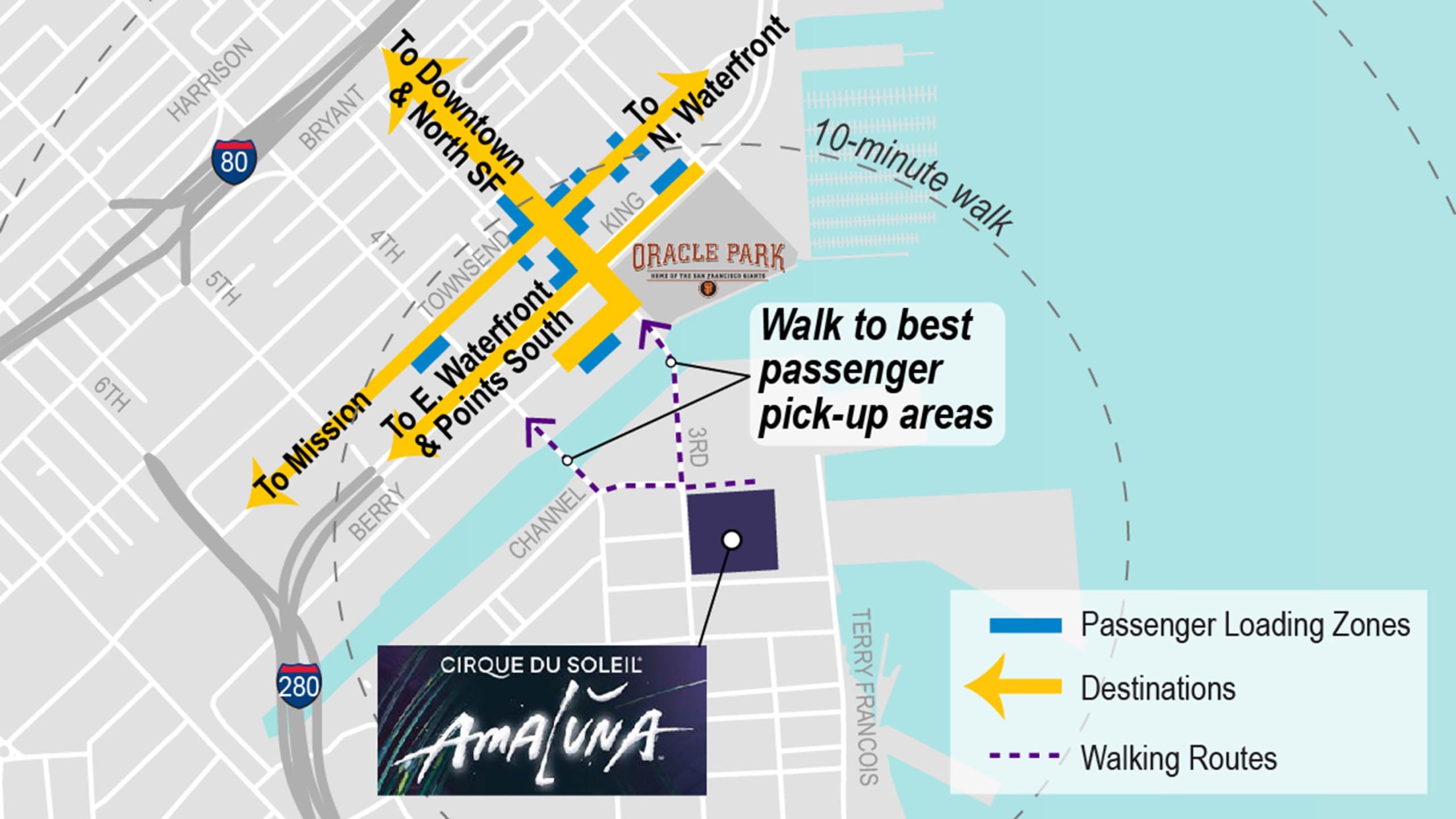 The best way to get a ride with app-based services like Uber and Lyft is to walk across the Lefty O'Doul Bridge and use passenger loading zones throughout the area around Oracle Park. See the map to find the nearest zones. We recommend the zones on Berry Street (between 3rd & 4th streets) and along 3rd Street (just north of King and Townsend streets).