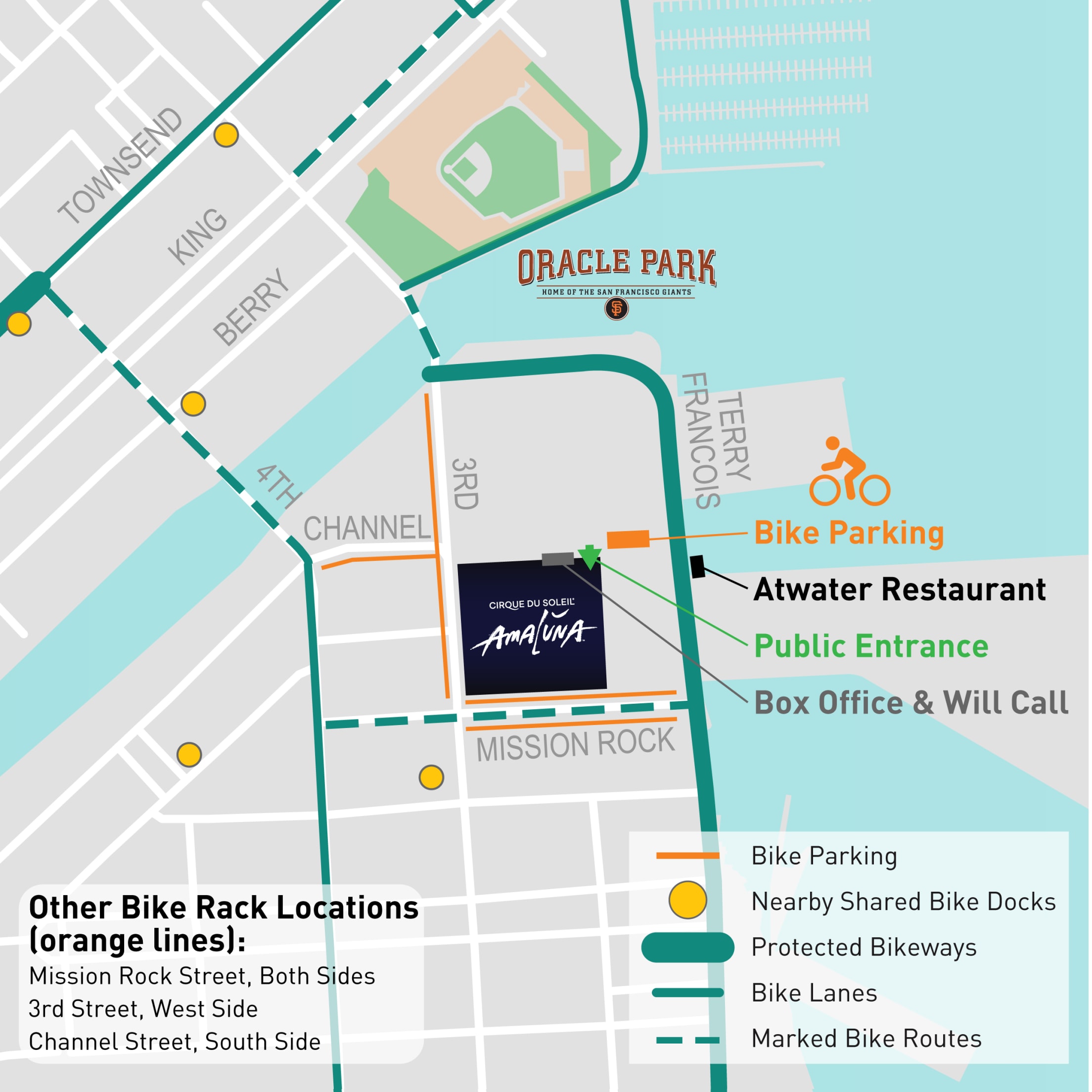 The Big Top may be just a short walk or bike ride from your home or office. Find bike parking just east of the main entrance to the Big Top (just inside Lot A, across from Atwater Restaurant), or along 3rd & Mission Rock streets. If you use a shared bike or scooter, be sure to lock to a bike rack or dock at a nearby station.