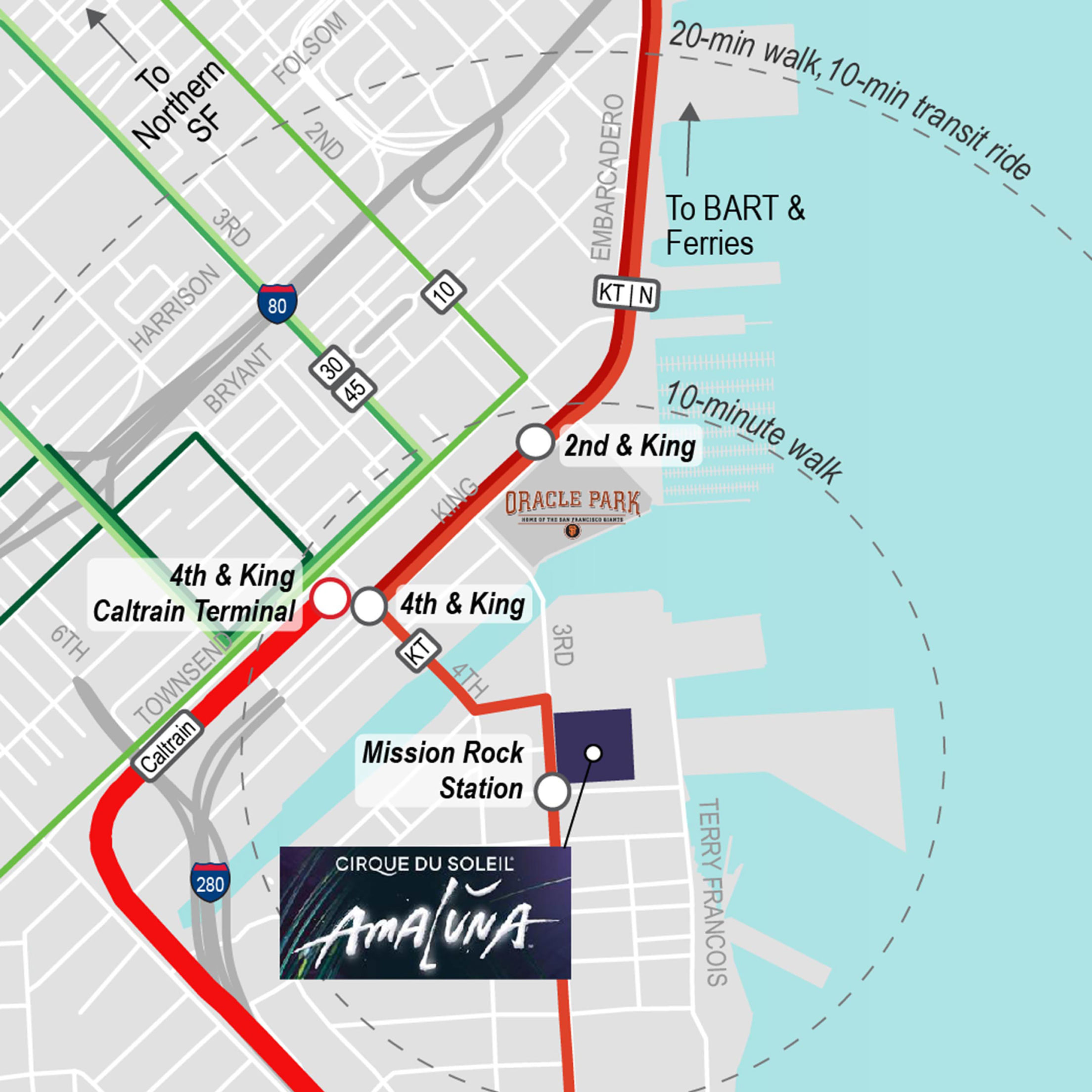 Public transit is the best way to get to Cirque du Soleil Amaluna. Muni Metro light rail serves the site directly via Mission Rock station, and Caltrain's San Francisco terminal within a short walk. BART and ferry service are just a short walk, bike, or Muni Metro ride away.