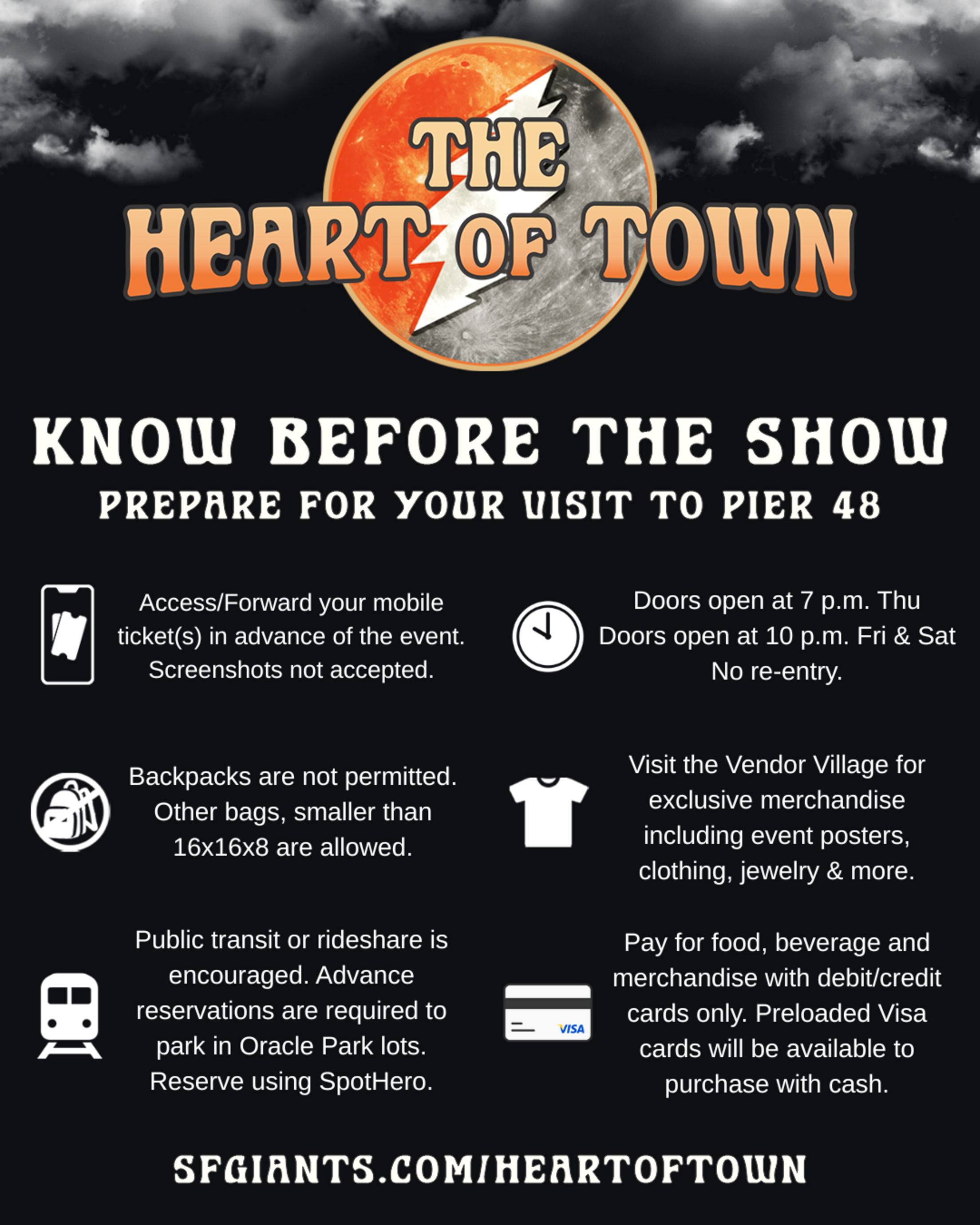 Then visit Vendor Village - the spot to browse and purchase vintage tees, poster art, vinyl, handmade goods and Grateful Dead-inspired gear. The Heart of Town official merchandise will also be available for purchase.