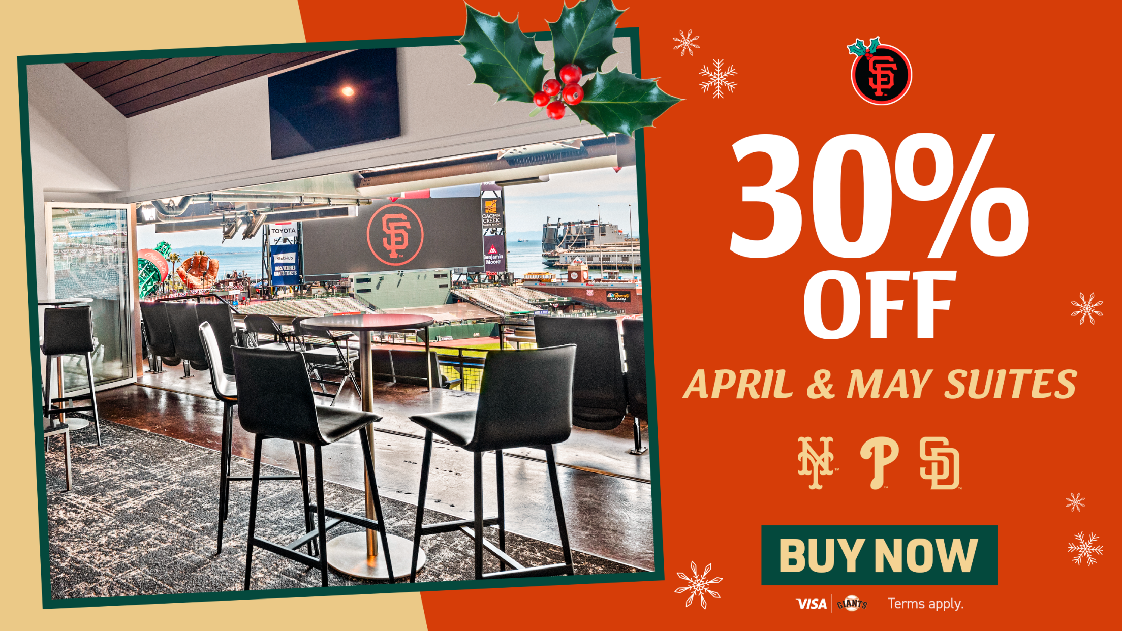 The Giants are offering holiday savings on suites - get 30% off suites for select April & May games at Oracle Park. Matchups include the Mets, Phillies and Padres.
