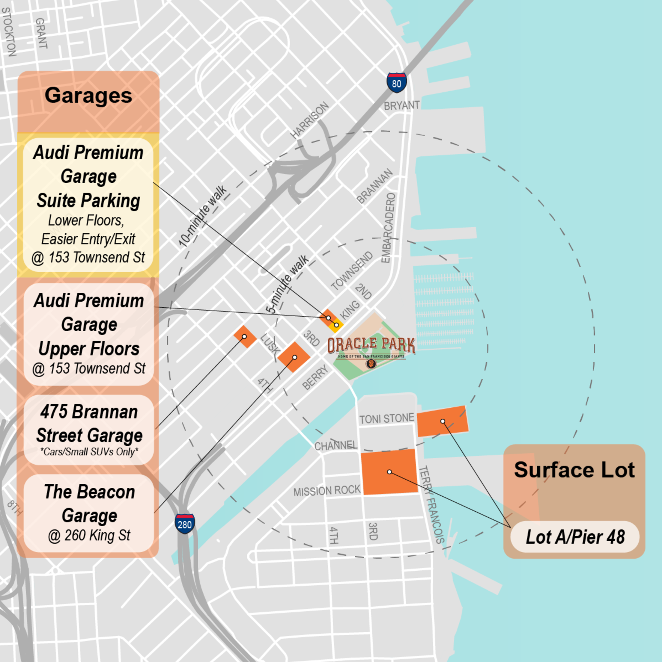 Choose between the best lot and garages around Oracle Park, featuring proximity to the ballpark, easy access to freeways and an elevated service experience.