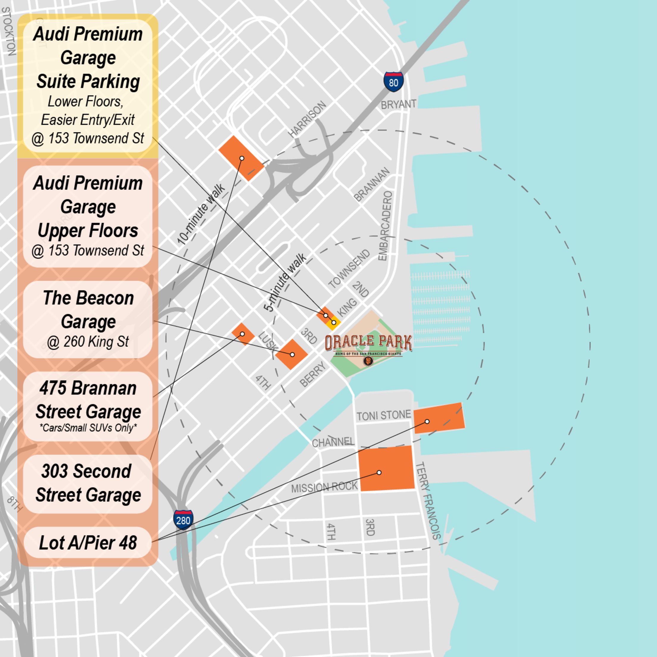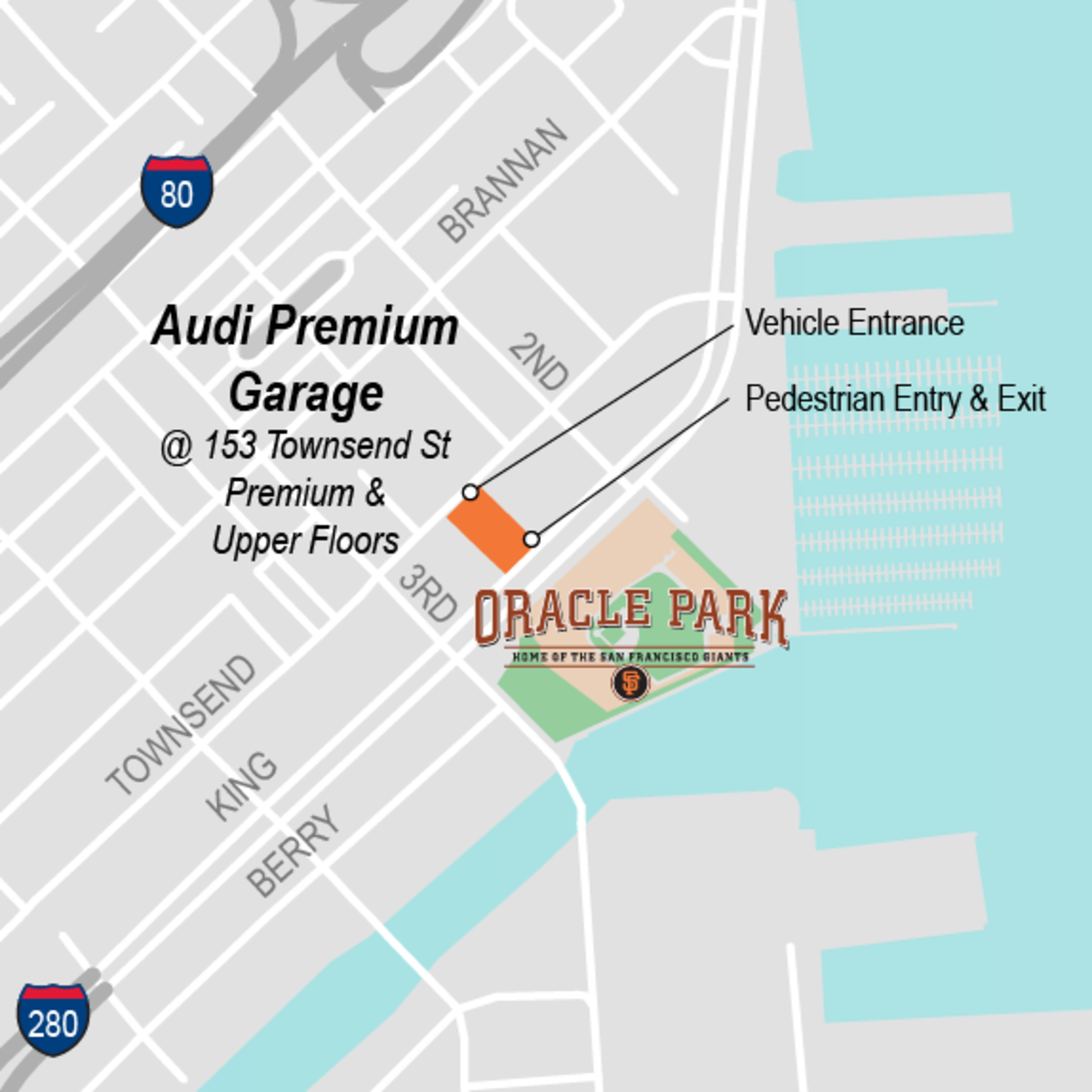 The Audi Premium Garage @ 153 Townsend Street (previously the King-Townsend Garage), is our exclusive premium parking option, located directly across King Street from Oracle Park.