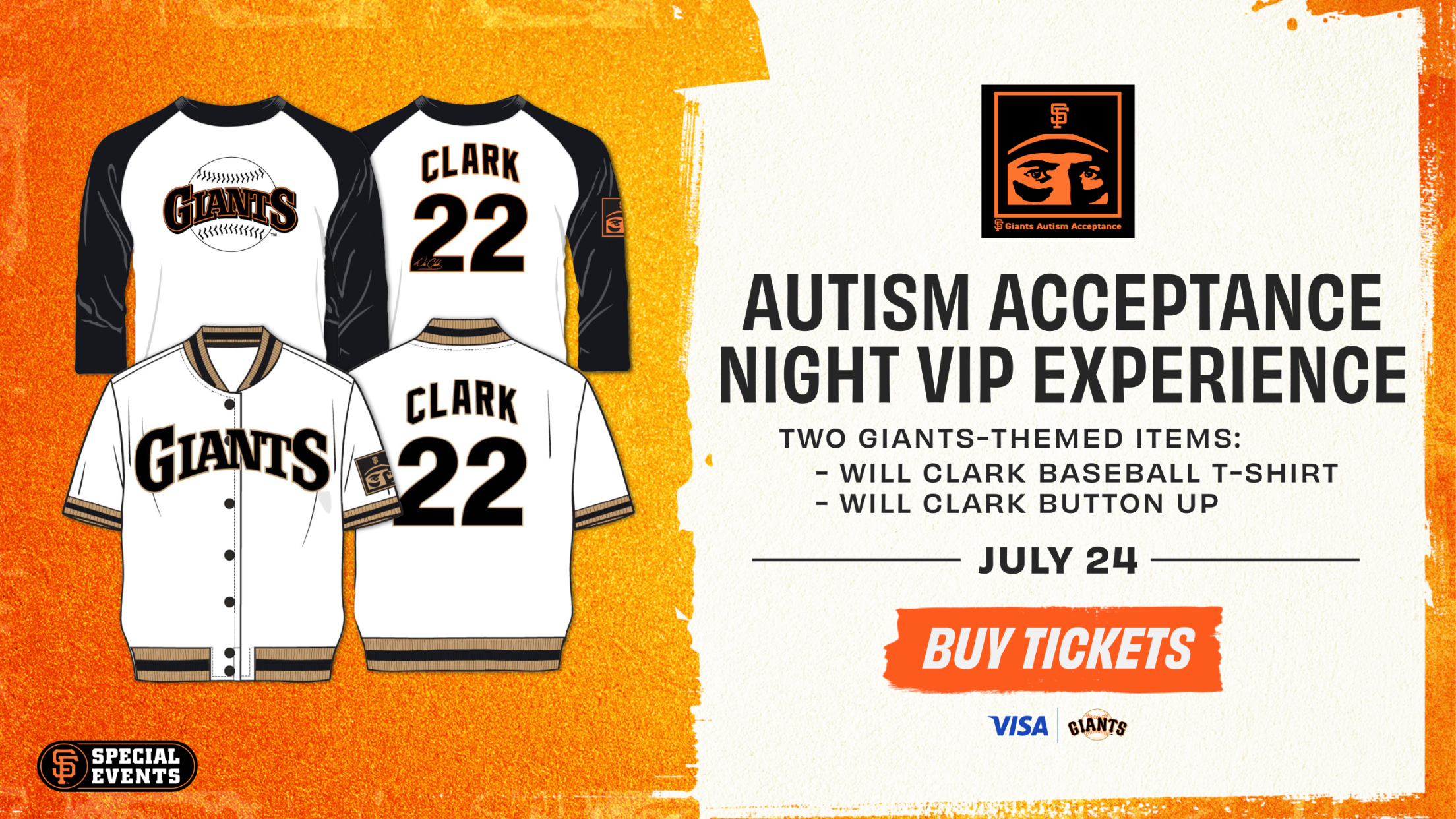 Join Will Clark, his family and the Giants for Autism Acceptance Night at Oracle Park. All parties are proud to celebrate neurodiversity, promote understanding and create an inclusive environment for all. Enjoy a heartwarming evening as the Giants take on the Los Angeles Angels. Partial proceeds from each Special Event ticket will benefit the Autism community.