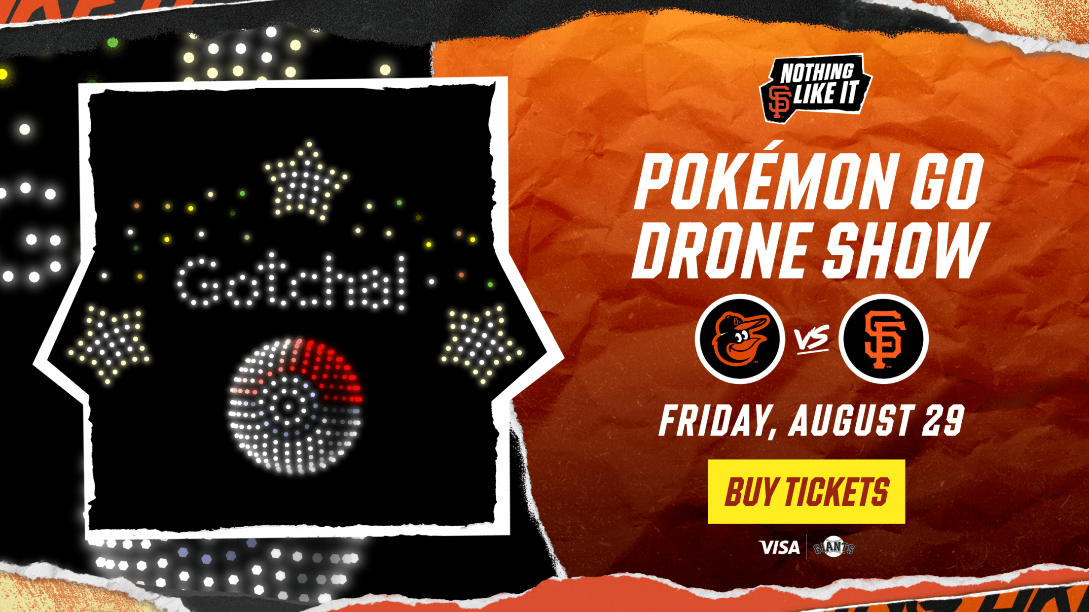 Catch a Giants postgame Drone Show* from your seat at Oracle Park where Pikachu will be in attendance. Themed with images of Pokémon GO, the skyhigh spectacle will take place after the Giants take on the Baltimore Orioles on Friday, August 29.